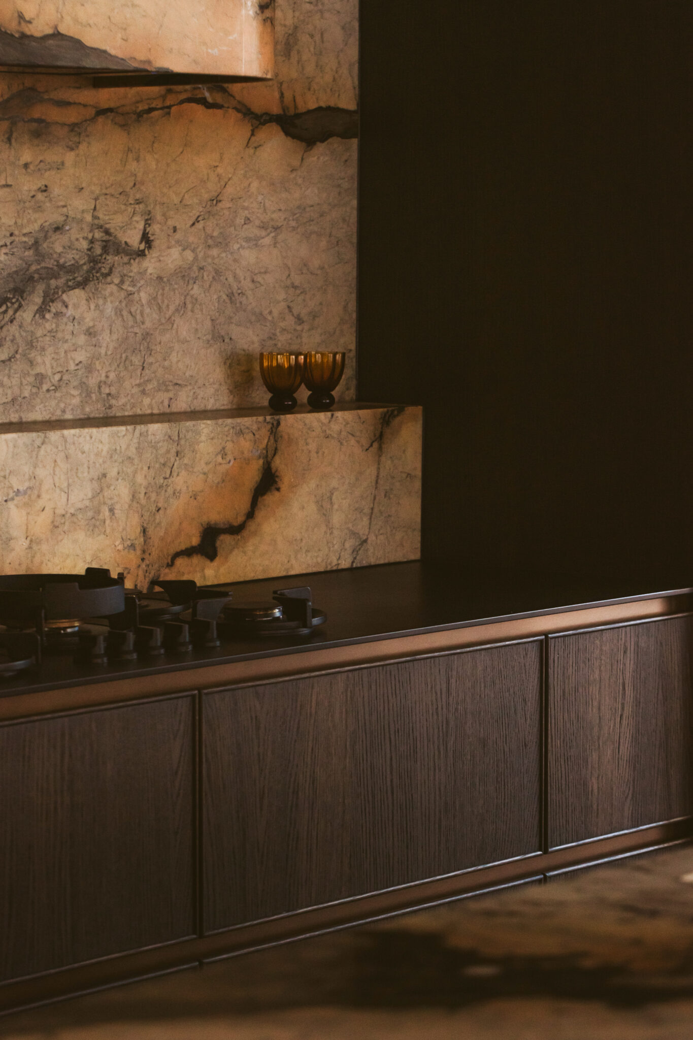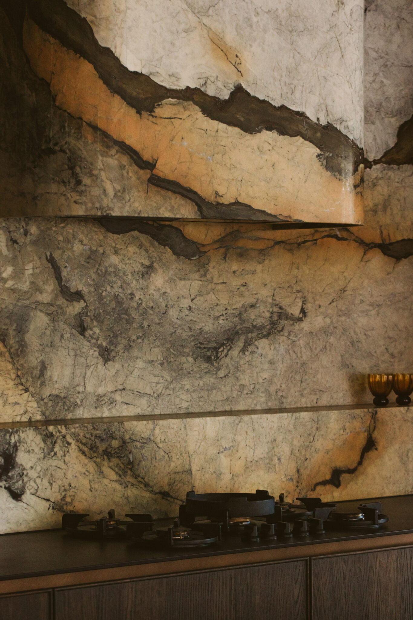 Applied across horizontal and vertical planes, the stone forms an island with a triple bullnose detail, folds seamlessly into an integrated basin, and wraps the splashback wall and curved range hood in vein-matched continuity. Even the sealants were colour-matched to preserve the sense of it being a single, fluid piece.