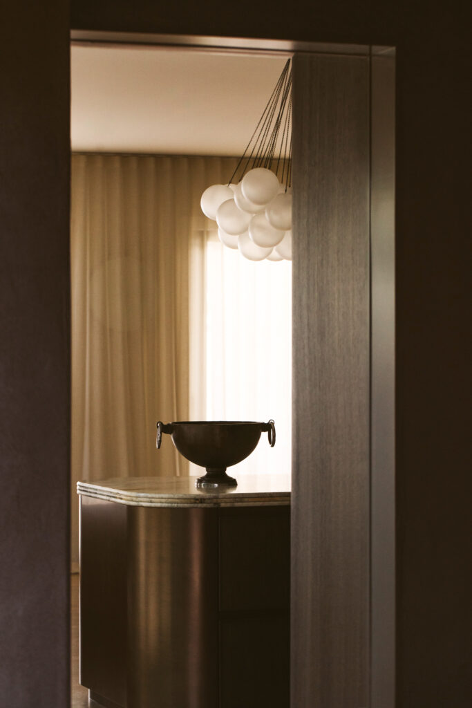 “We incorporated bronze into the chain, while the irregular texture of the glass echoes the more neutral tones of the marble. It’s a touch of glam.”