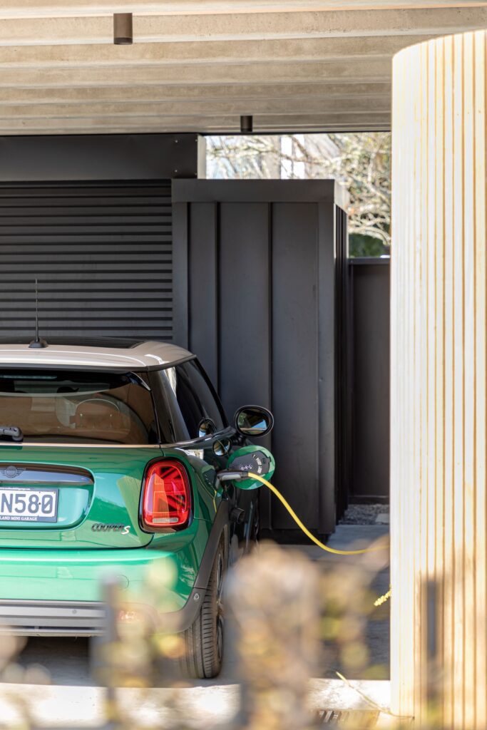 “The clients’ aims aligned with SGA’s philosophy and design principles. Concrete construction means there’s a high thermal mass and a stable indoor temperature, which reduces the need for heating and cooling. There’s really good crossventilation and deep eaves, while the automation system means appliances are automatically turned on and off, avoiding excess energy consumption.” A wall-mounted EV charger was installed, which provides the safest and fastest way to charge an EV at home, according to home energy efficiency expert Gareth Gretton, at EECA (the Energy Efficiency and Conservation Authority). “It allows homeowners to easily schedule charging to take advantage of lower off-peak power costs,” Gareth explains.