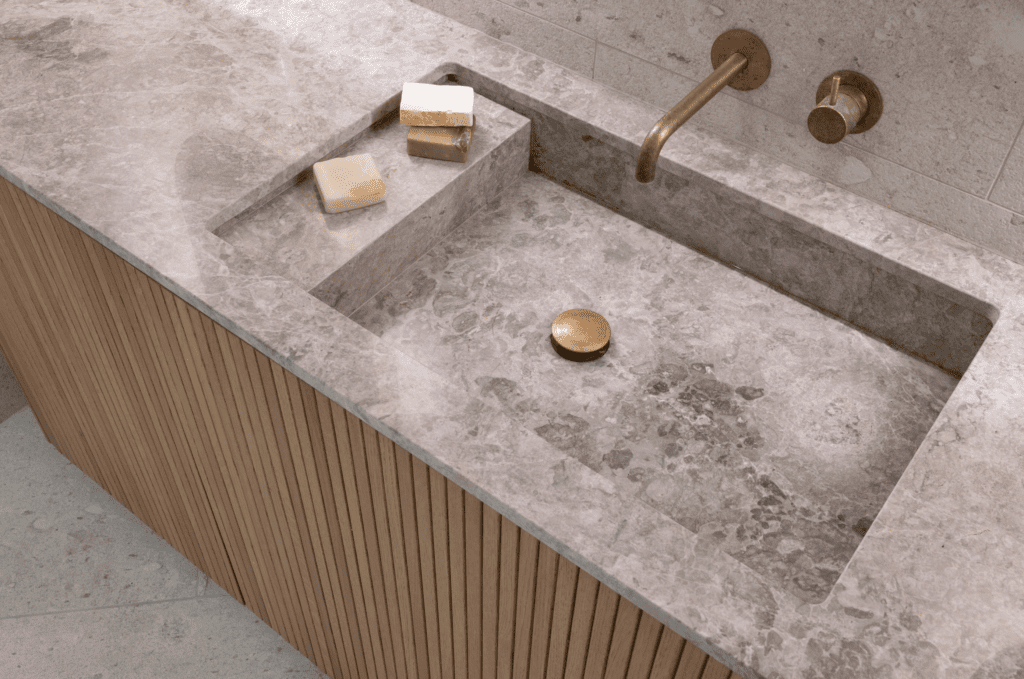An organically shaped stone bath sits beneath a cascading garden overhead, which creates symmetry and removes a previous void. Biophilic elements continue throughout, with delicately tones and textured moonstone tiles laid in a herringbone pattern on the floor and offset on the walls, pill-shaped mirrors, a travertine vanity, and fluted oak cabinetry.