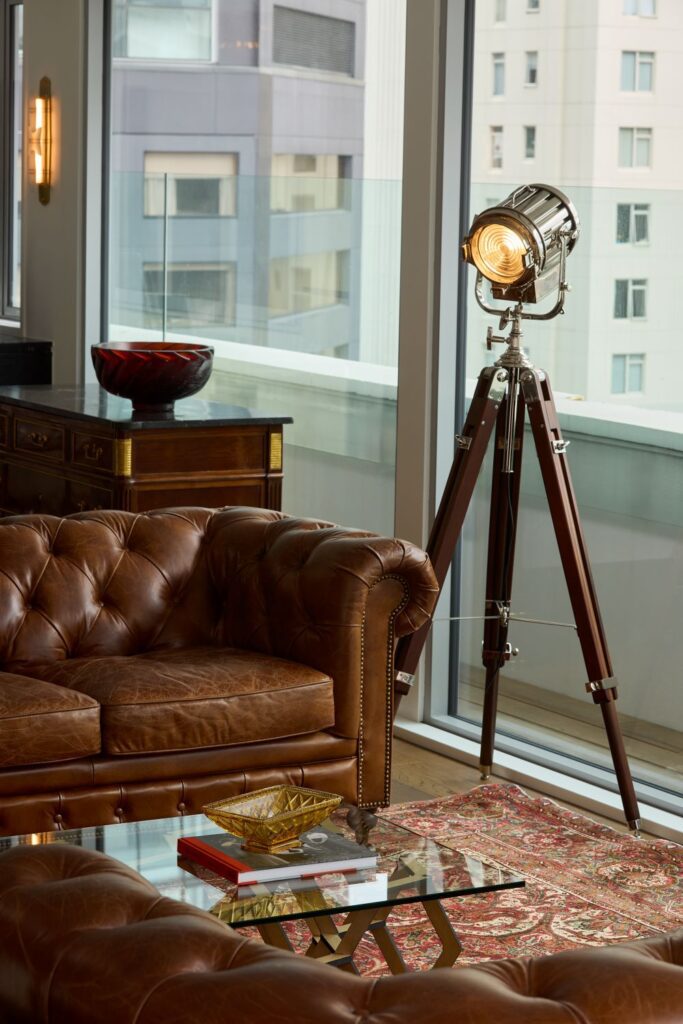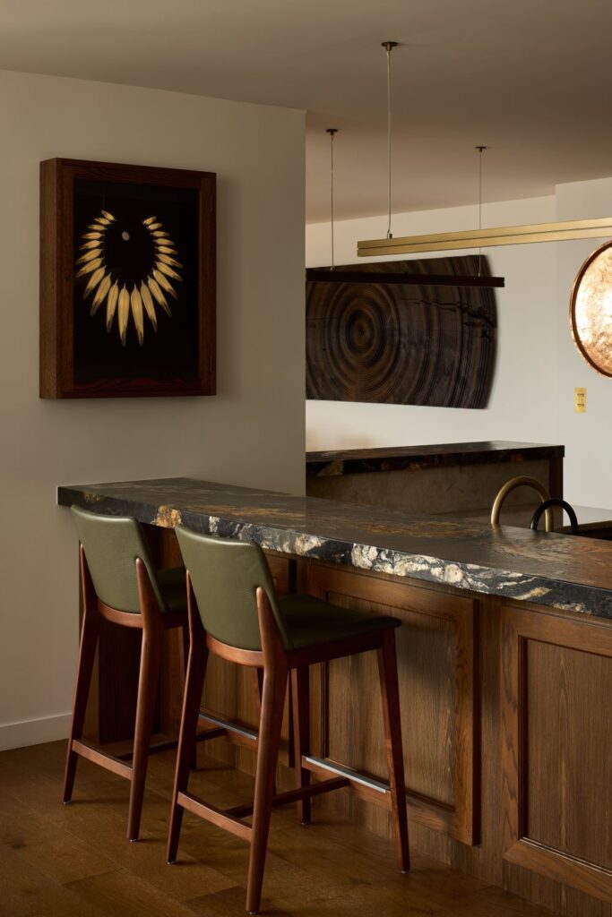 There’s a stylish bar area in the living space, used for entertaining. The architects designed it to include a sink, a drinks station, and bar lined in green leather, at which to enjoy a cocktail. A folded bronze light fitting was custom-designed for the area and hangs on the wall like a sculpture.