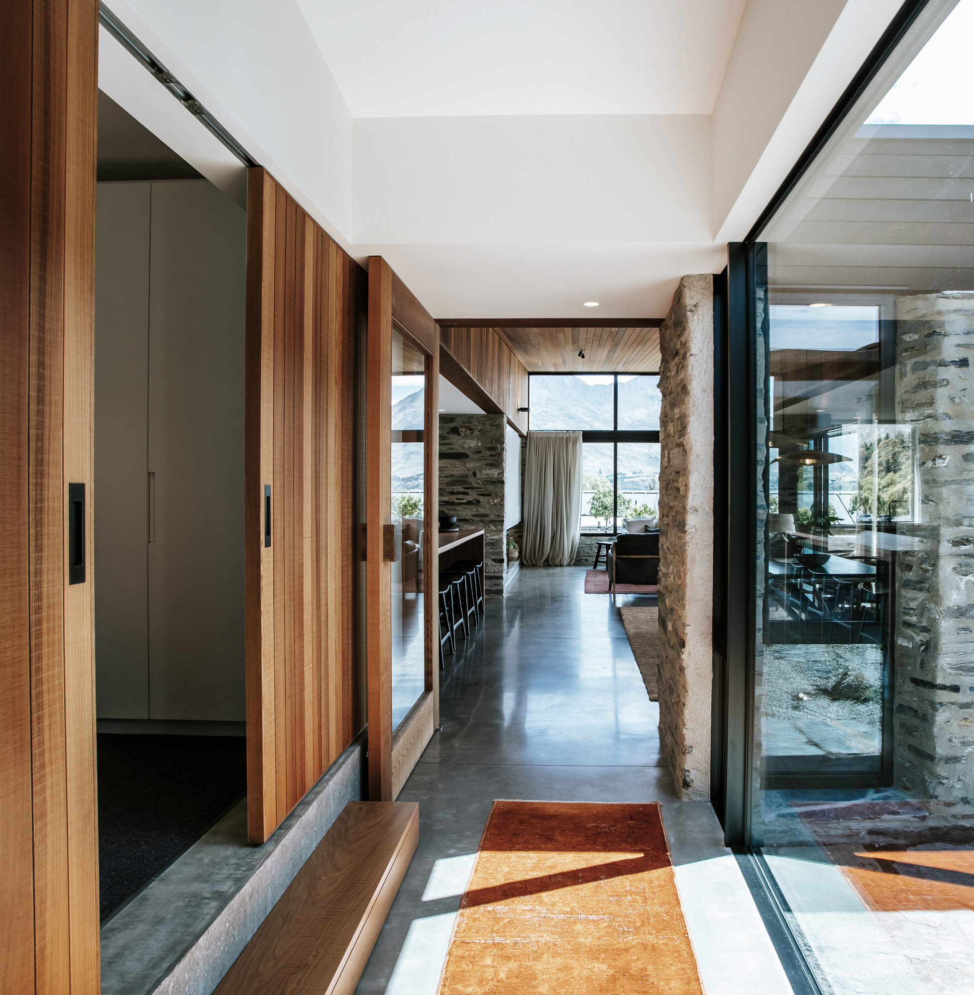 I used this stone as a base to solidify what is a light-weight timber framed building. The schist acts as bookends to the living space, which continues to the exterior, wrapping the outdoor spaces to protect from the enormous natural landscape it looks out on.