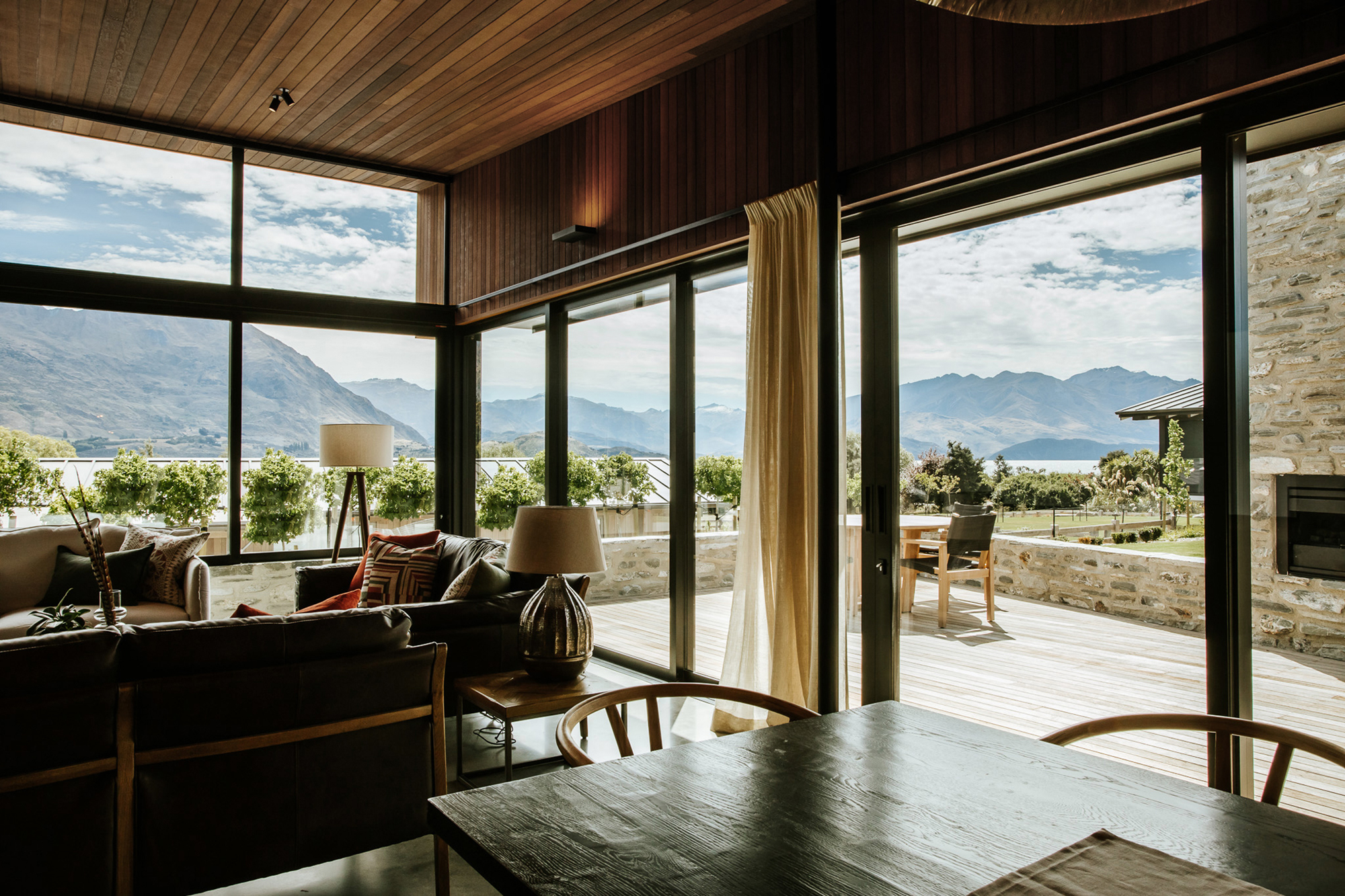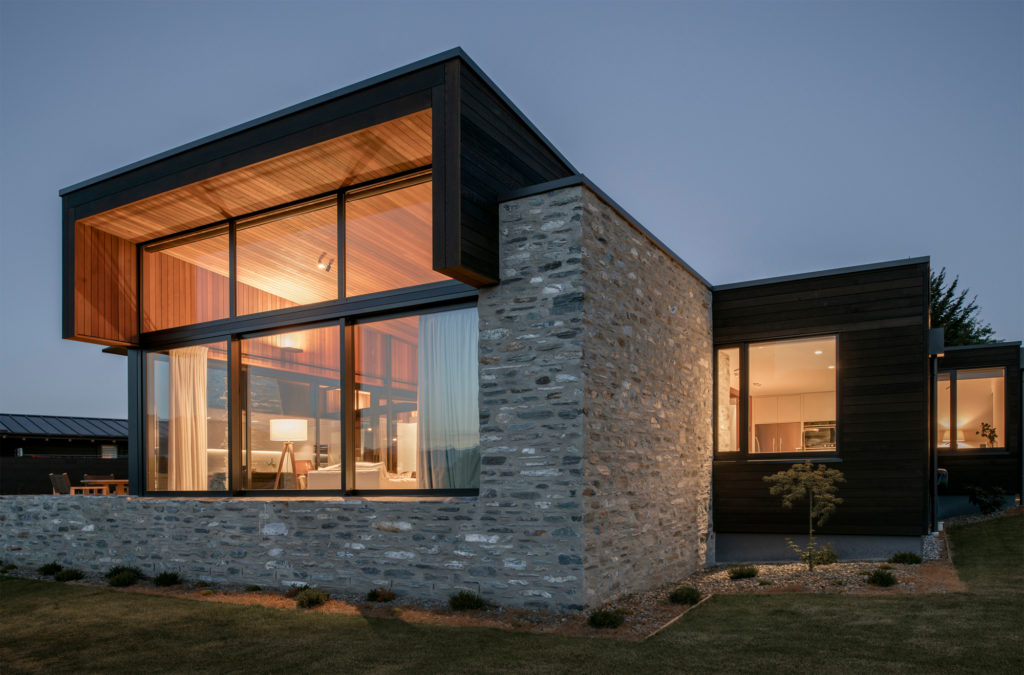 MC: The gently inclining roof form allows dramatic scale of the house. The scale the windows achieve allows views of Mt Roy and Treble Cone.