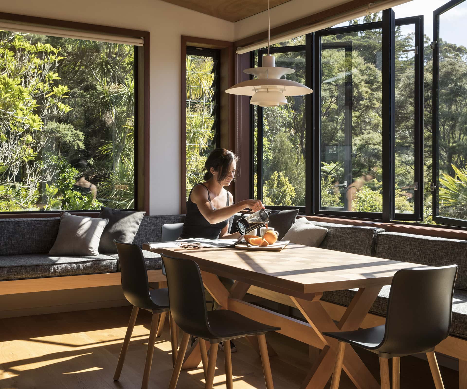 The design had to deal with the challenge of capturing sun and light, a task complicated by the presence of a large house to the north. “We looked really carefully at what the sun does and where it tracks through the day,” says de Pont. “We’ve got a lot of sun to the east – the morning sun is available all year round, so we just grabbed as much of that as possible.”