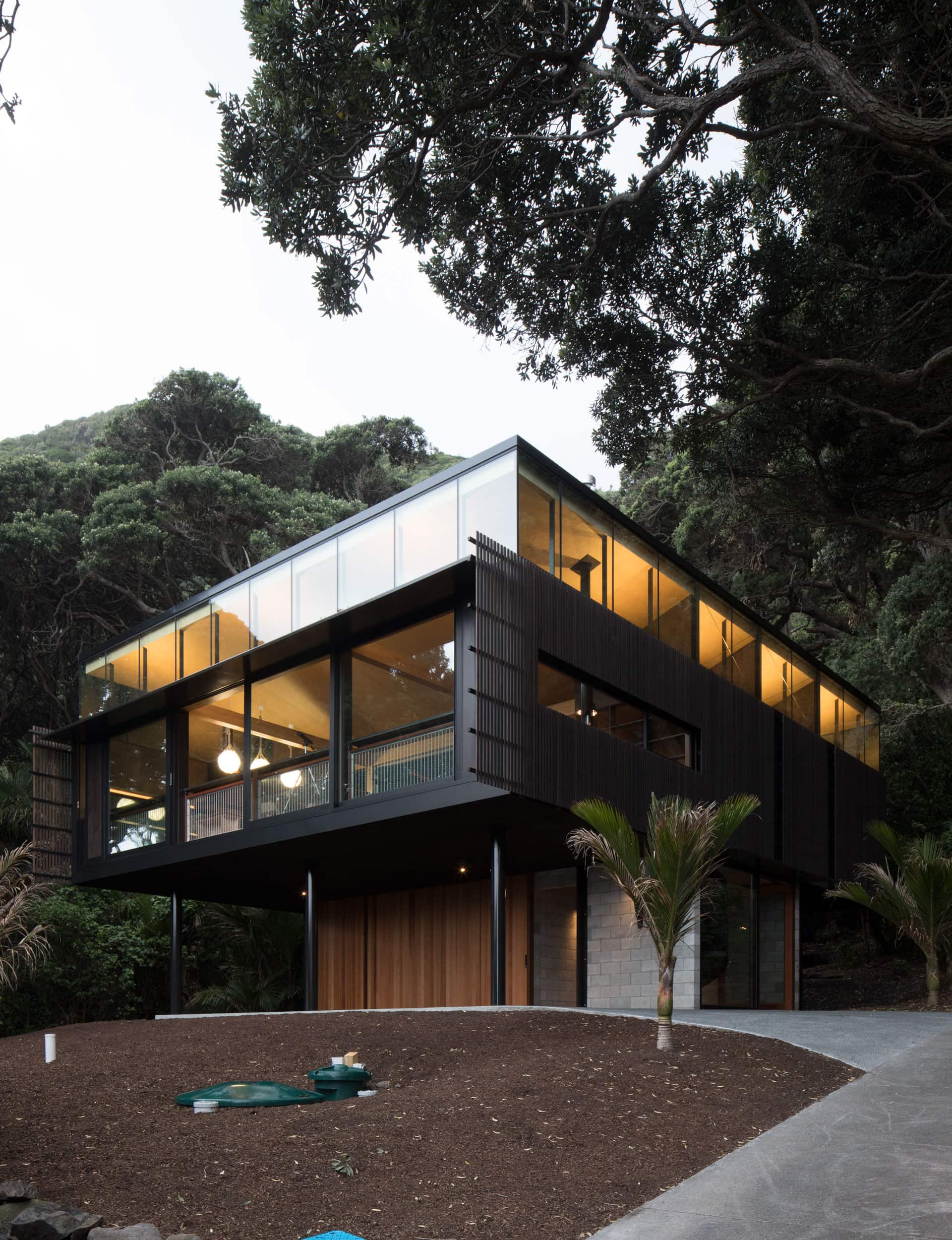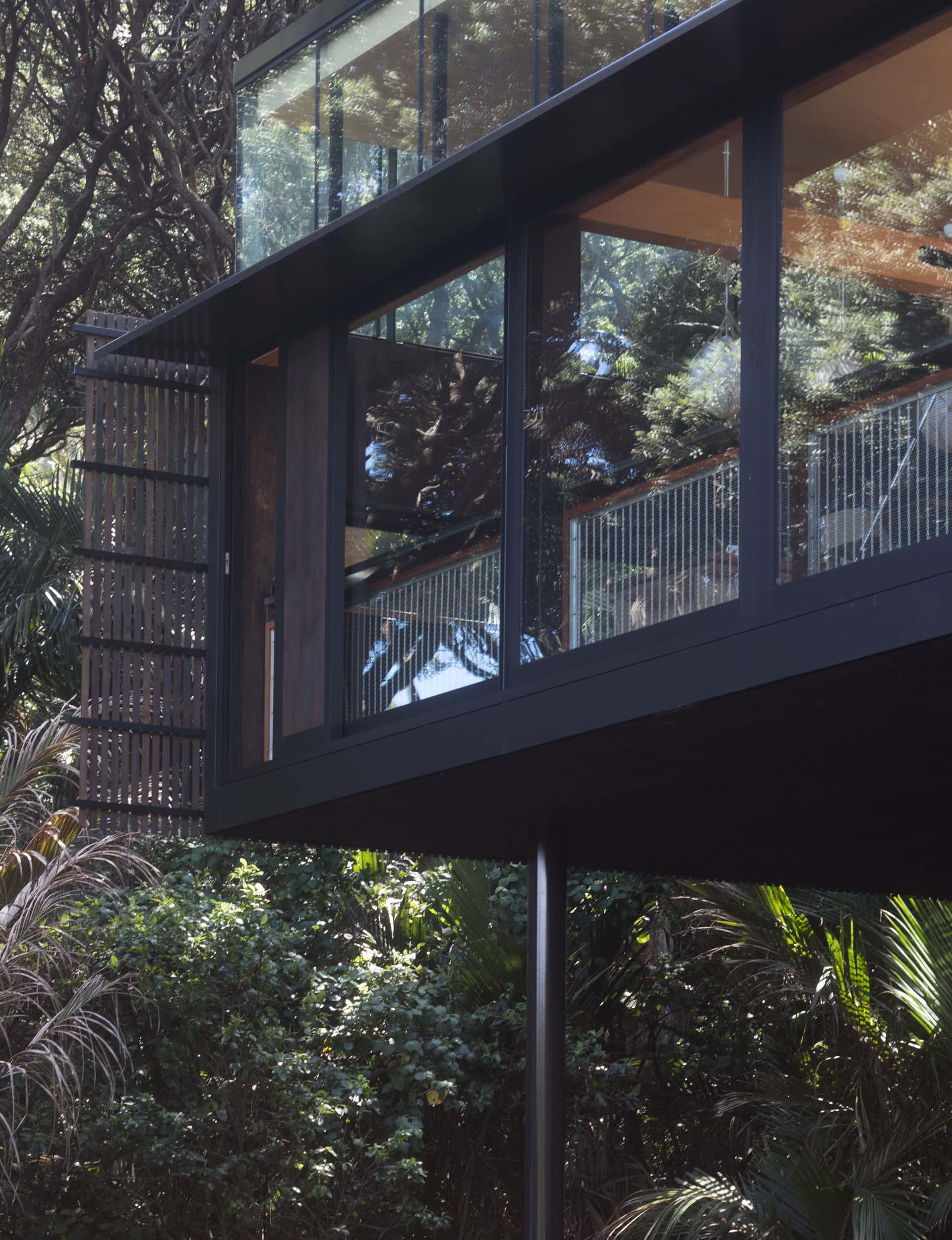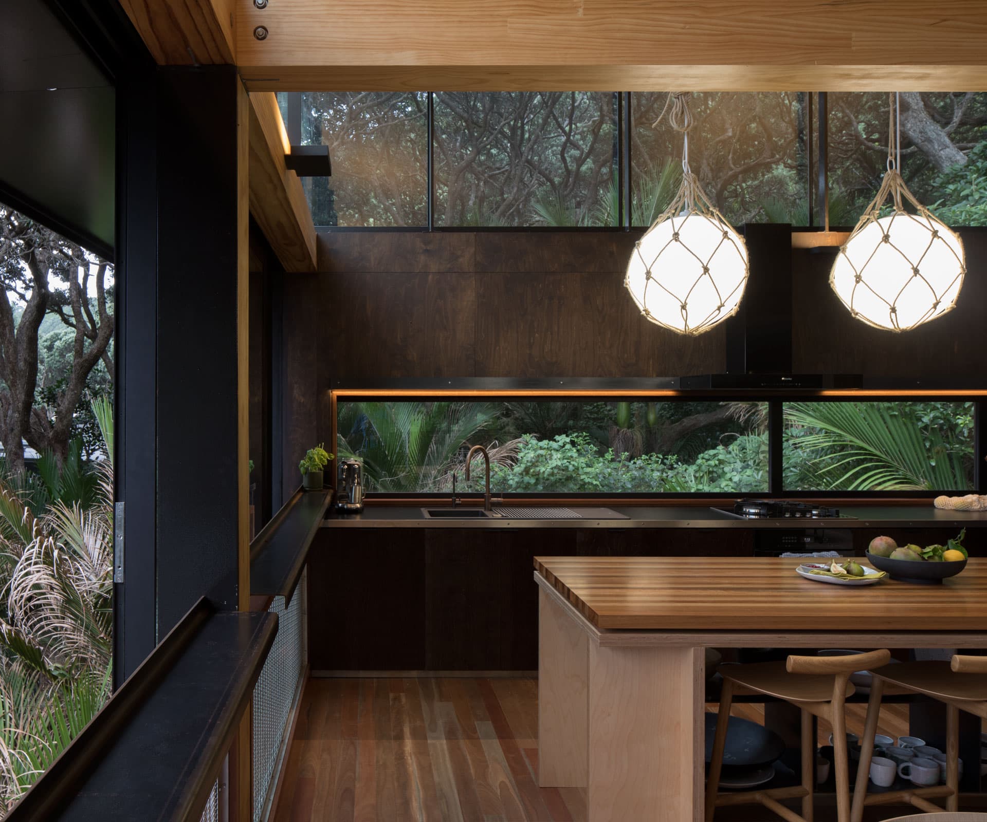 “We wanted to play down the wall planes with the dark colour, making them recede into the background, into the pōhutukawa boughs,” says Lance of the move. “The fact that we’re so sheltered from the sun allowed us to do this very glassy response.”