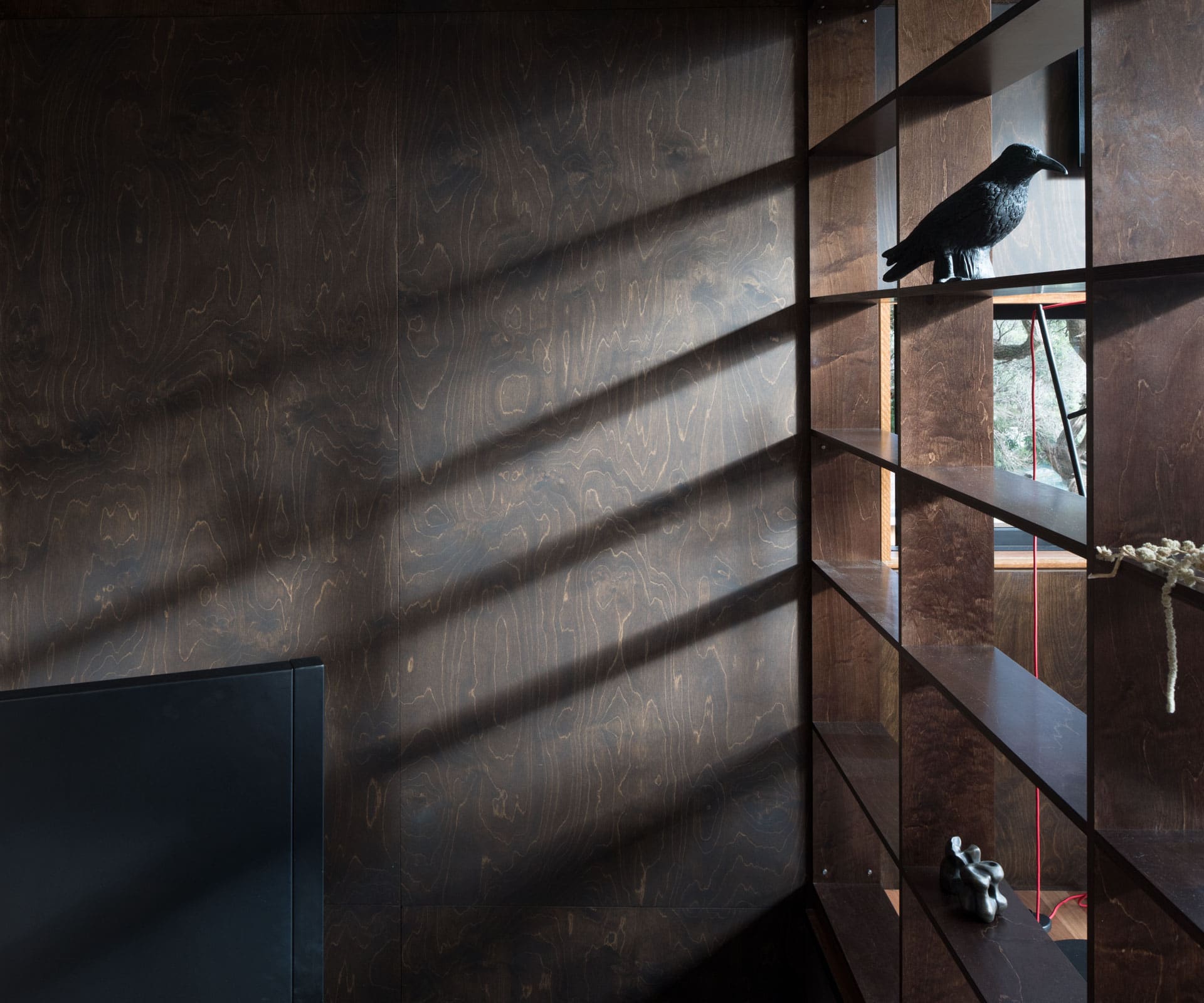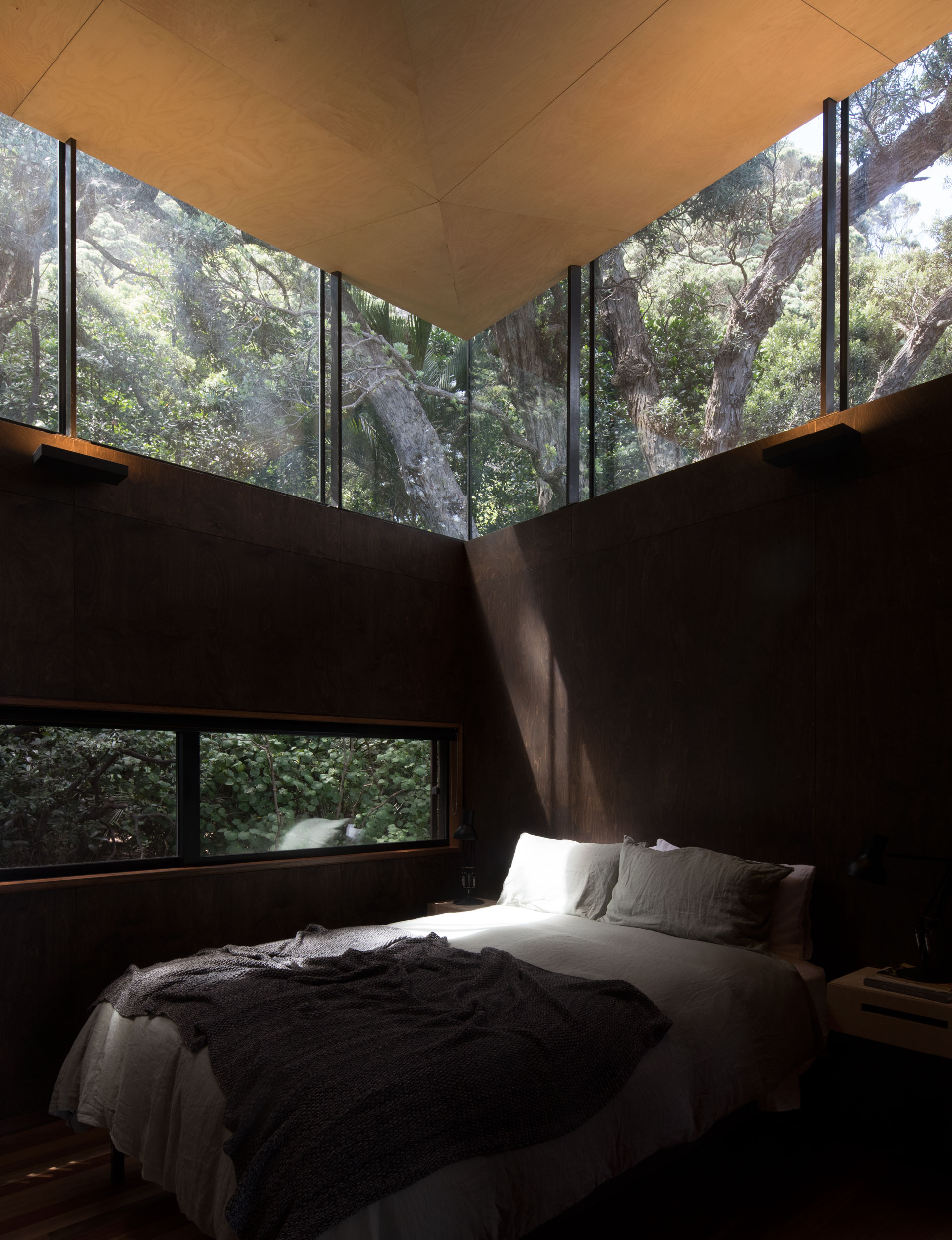 Every opportunity has been seized to bring in the light and draw attention to the tranquility and beauty of the site. Unusually, the interior plywood walls have been stained a similar dark brown to the tree boughs, while the inward sloping ceiling of light birch pulls your gaze up to a continuous clerestory window that wraps the perimeter of the house and captures the tree canopy.