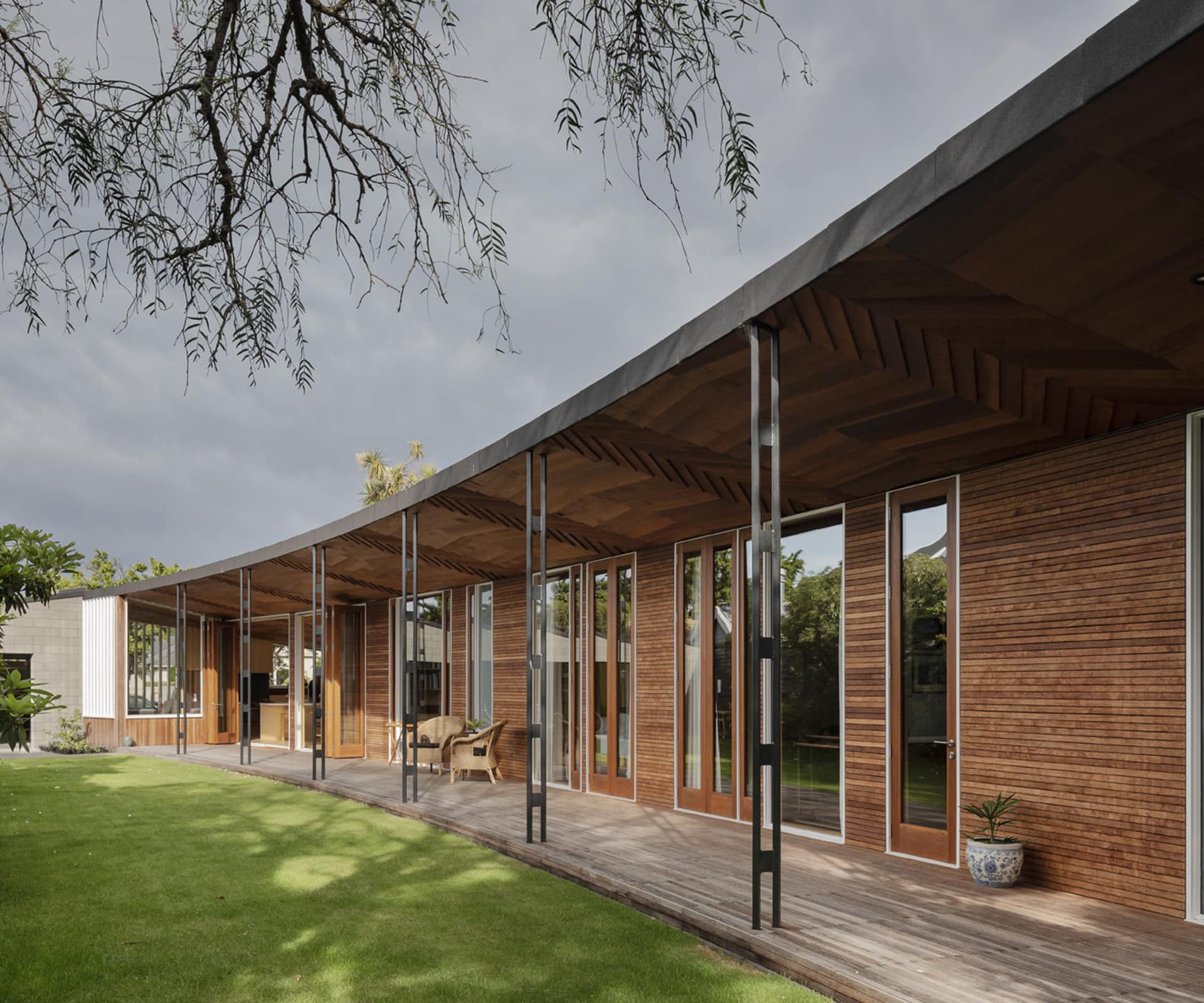Michael O’Sullivan’s designs always have a distinct aesthetic and this home is no different. Combining black rubber cladding with concrete block on the outside, and O’Sullivan’s intricate timber detailing inside, the house forms a gentle arc around a courtyard. An intriguing response to suburban living.