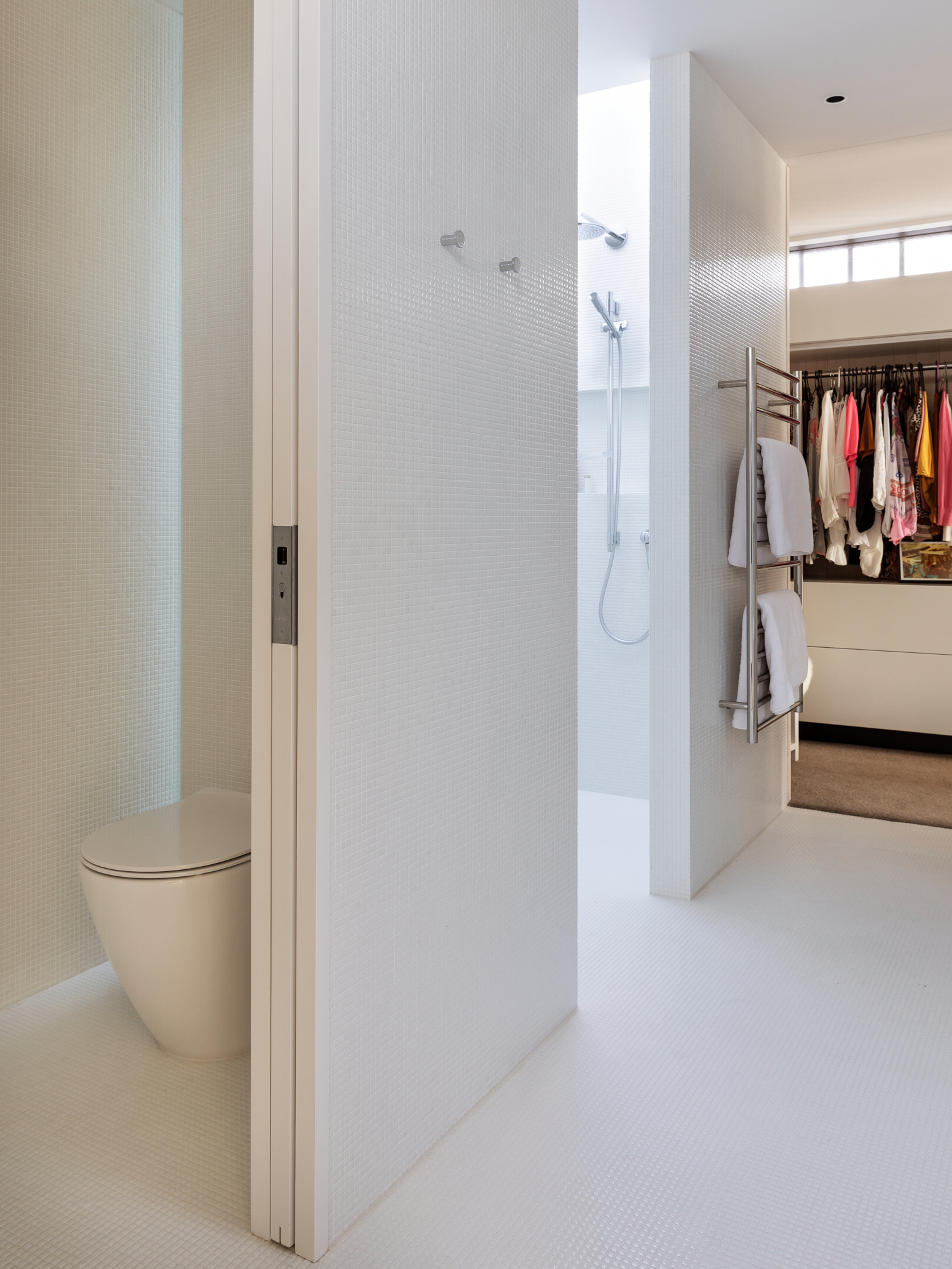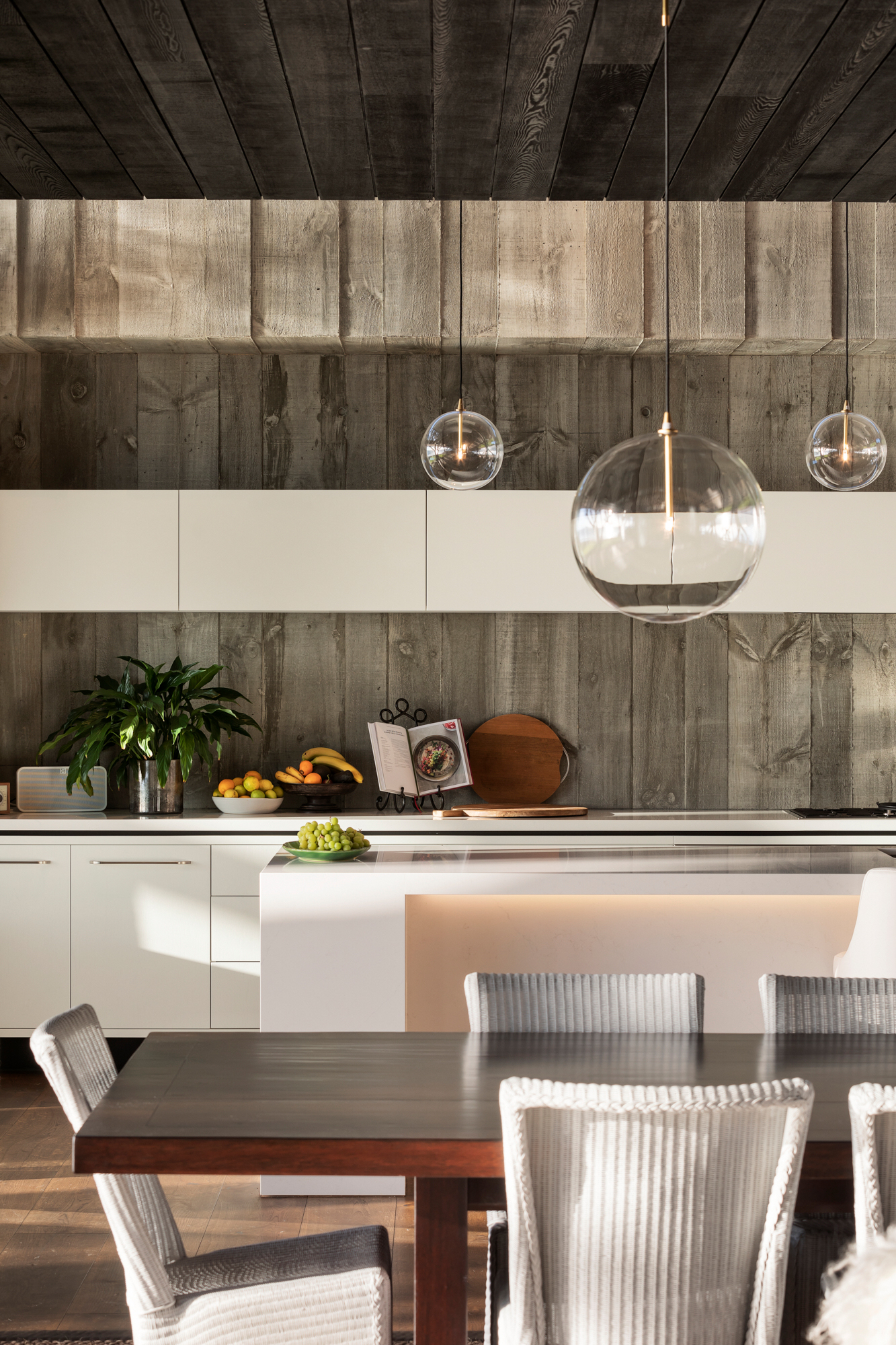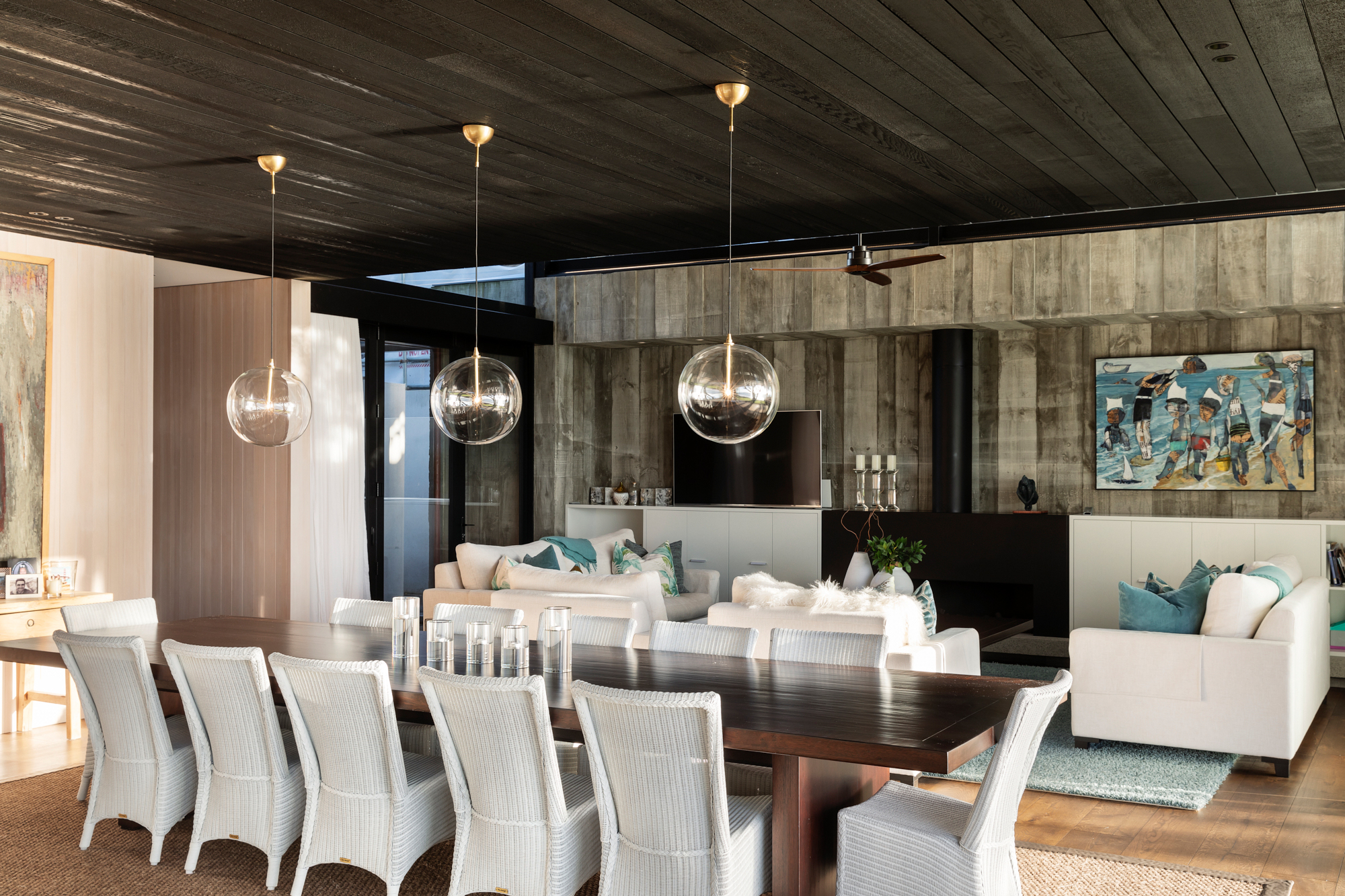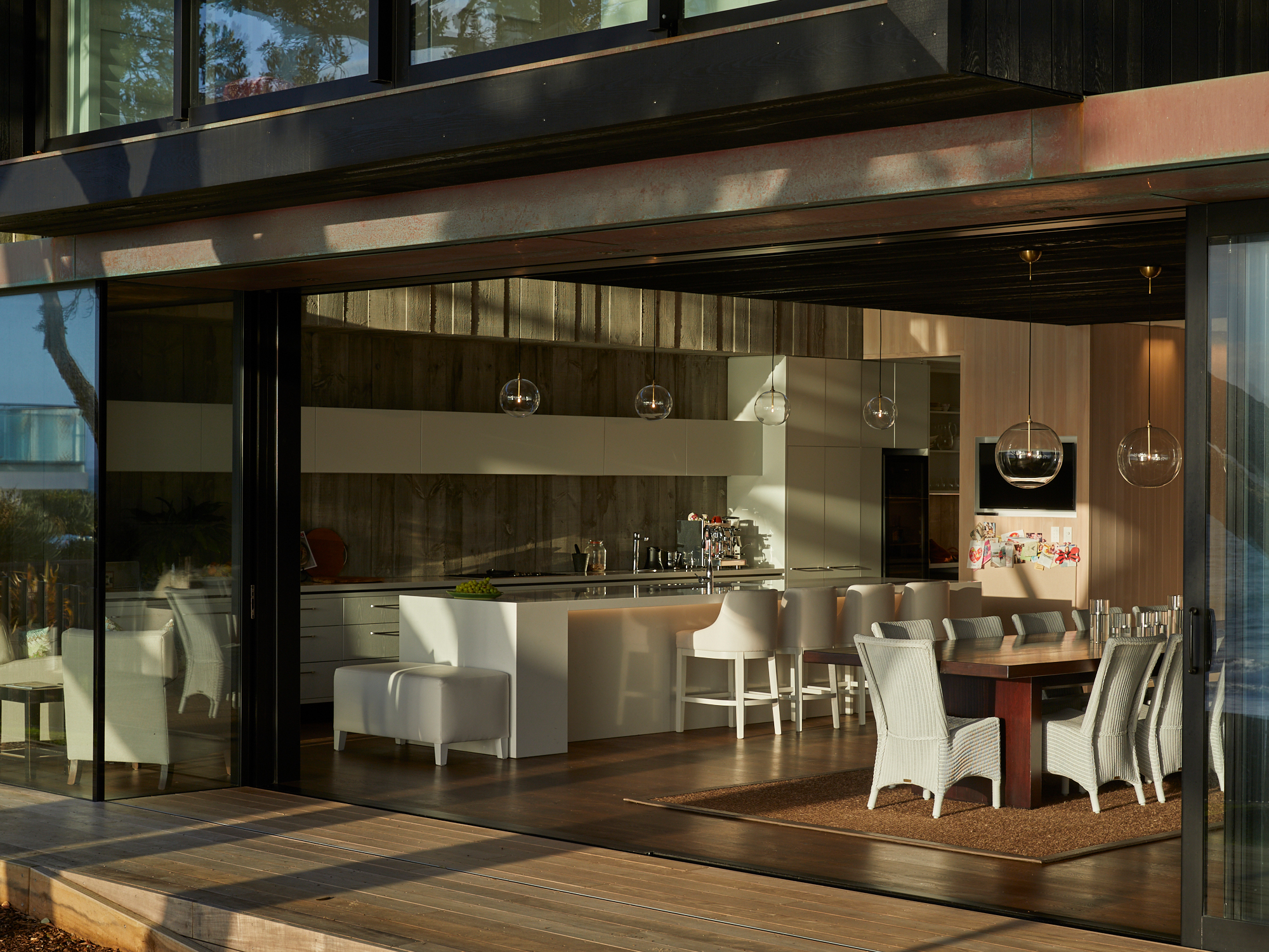 Part of the brief was to capture a Hamptons aesthetic, to emphasise the coastal feel. This was achieved in a contemporary way with design moves such as white kitchen cabinetry with a perimeter detail and white-washed timber lining the inner walls. This juxtaposition of city chic and beach-house casual nails the best of this locale, where the owners can wander up the road for a coffee or down off their lawn onto the beach. Hamptons-style internal shutters give the flexibility of privacy or light while exterior battens, where climbers are encouraged to cloak the home, are visual filters. This double layer of seclusion is no blunt instrument. An element of transparency remains.