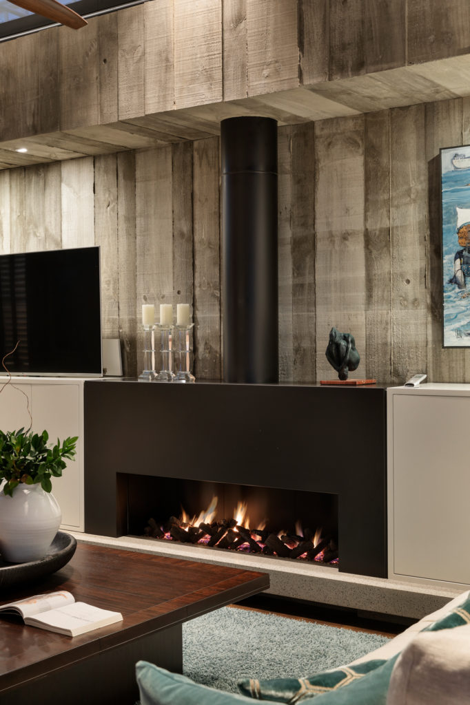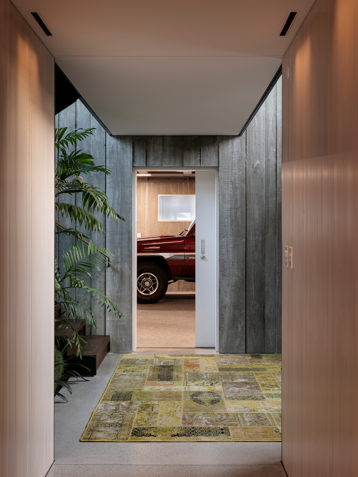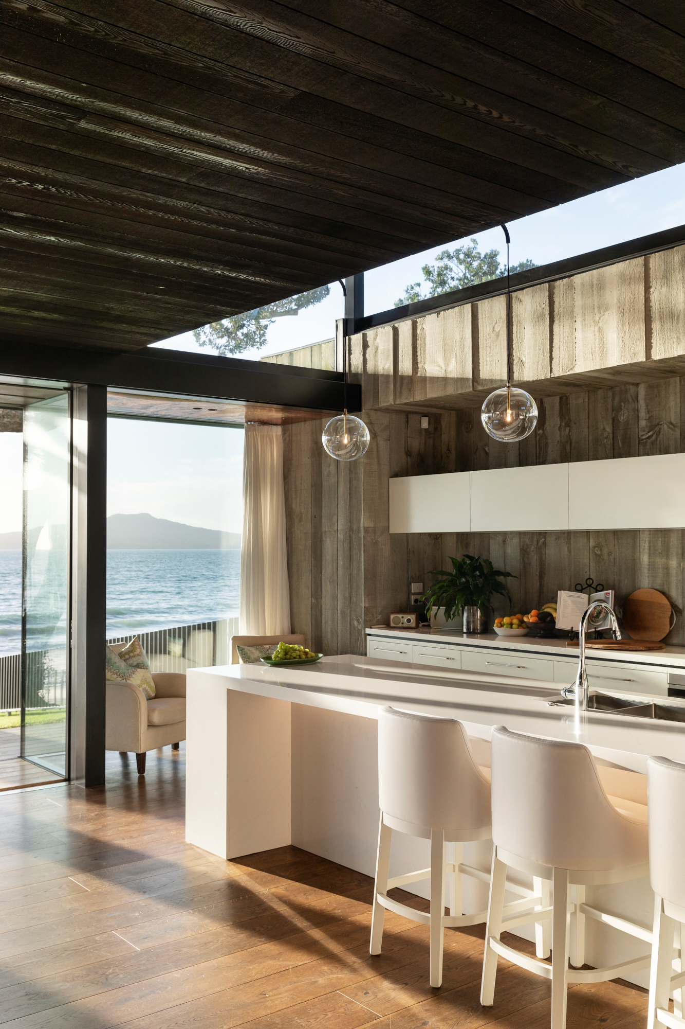 Clerestory windows capture the sky; in the centre of the room, a dropped ceiling clad in charcoal shiplap cedar slices through the middle and cantilevers towards Rangitoto — conical and iconic.