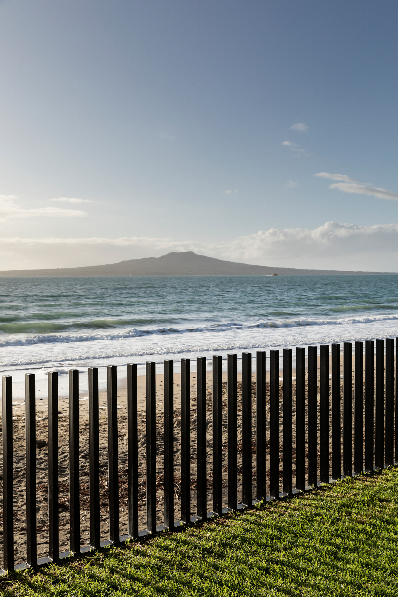 That is exactly what was wanted for the front lawn, too, where two spreading pohutukawa are natural sentinels. They serve a dual purpose. Looking out, they are a rich foreground to the ever-dynamic view; looking in, their branches screen the occupants, the house tucked in behind, its recessive colours blending with the bark. If it wasn’t for the dogs, there would be no fence between private and public space. As it is, a dark-toned rail-less picket is a subtle gesture.
