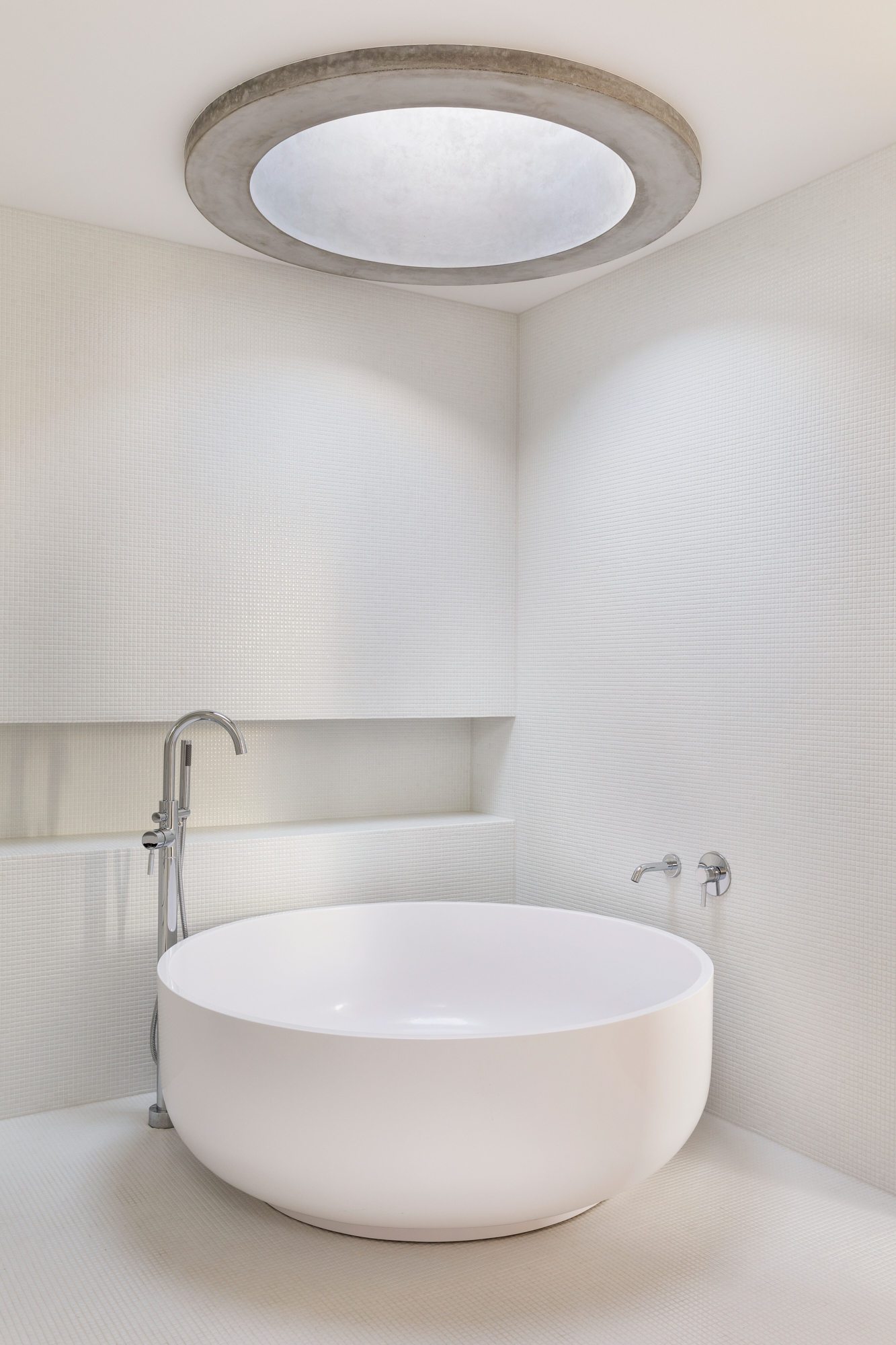 Upstairs, where the bed offers a ship’s captain’s view of time and tide, the bathrooms are like snow caves clad top to toe in tiny white mosaics, and a green roof flanks the passageway to alleviate the up-close built environment.