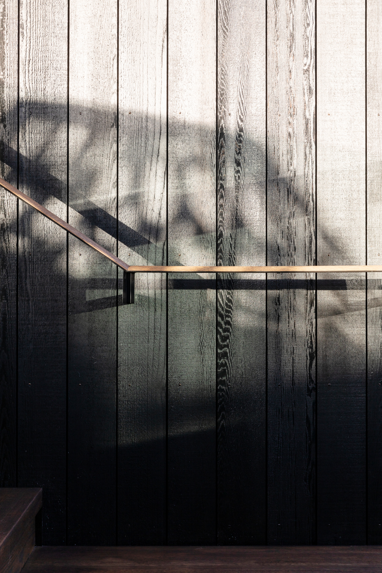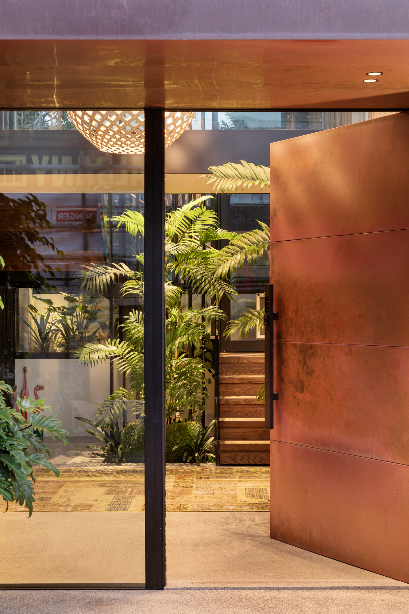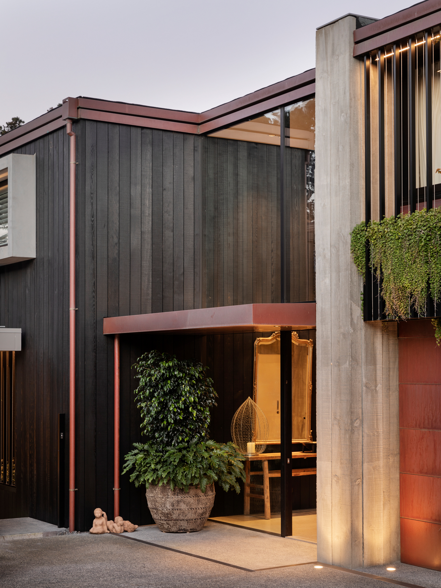 Copper bays on both sides of this form wrap around the wardrobes in the main suite and are also a clever disguise for the air conditioning on this level.