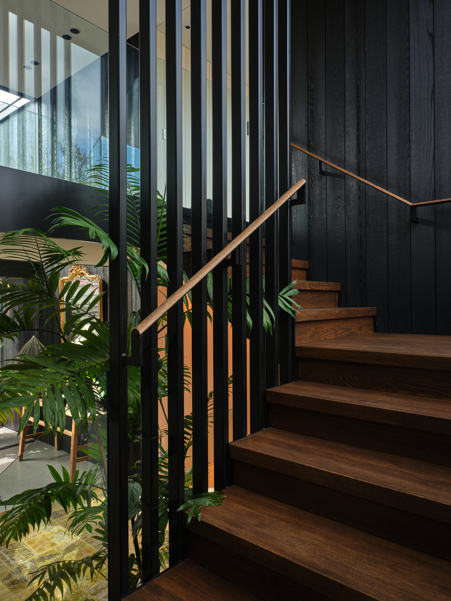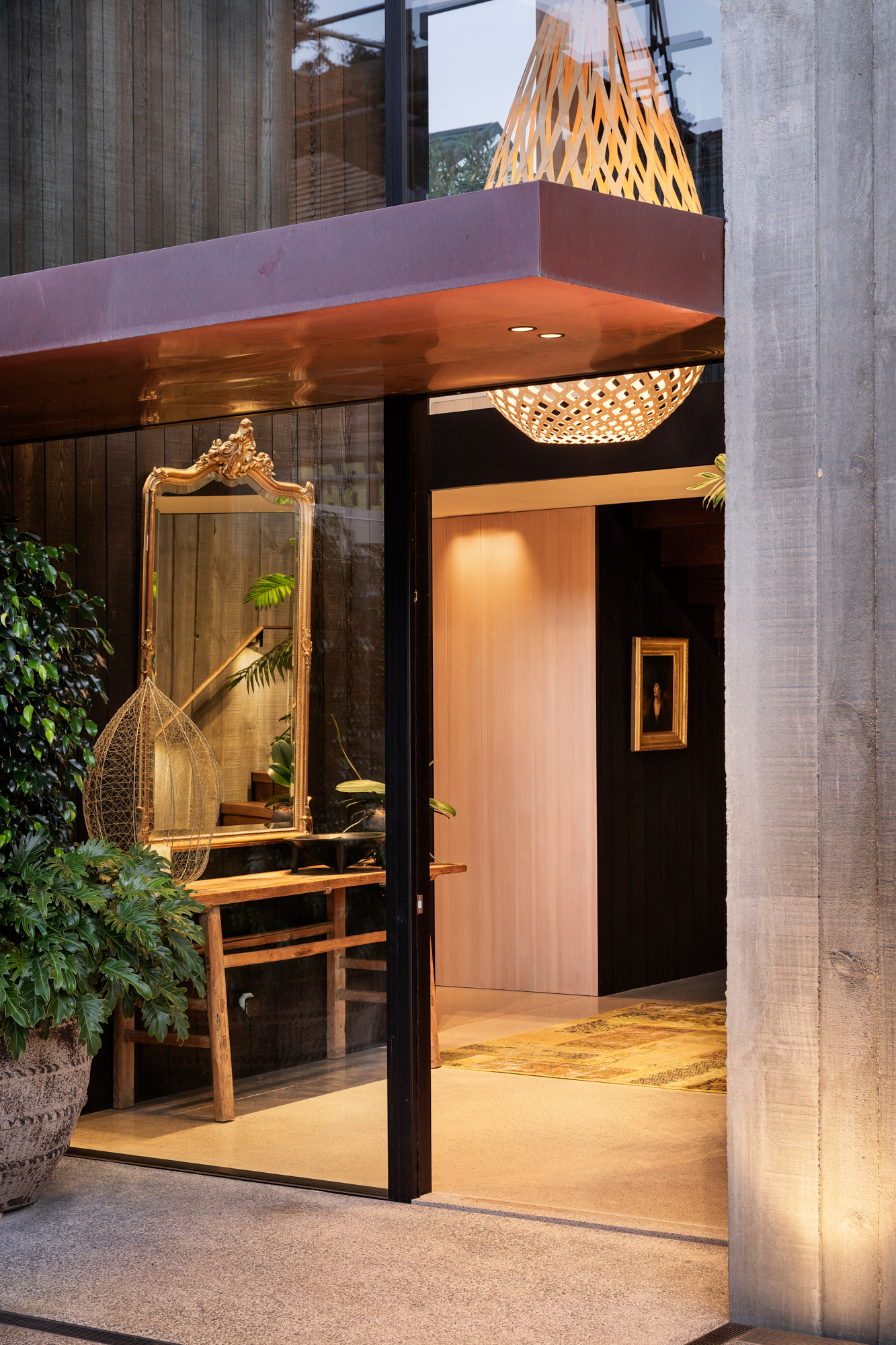 In the double-height entry atrium, a staircase zigzags through the void to a mezzanine bridge, and a palm in a sunken planter speaks to the greenery beyond the glazing. The natural tug is to turn left towards the sea, and a central hallway with a sloping ramp — a homage to the original home — delivers a snatch of the view.