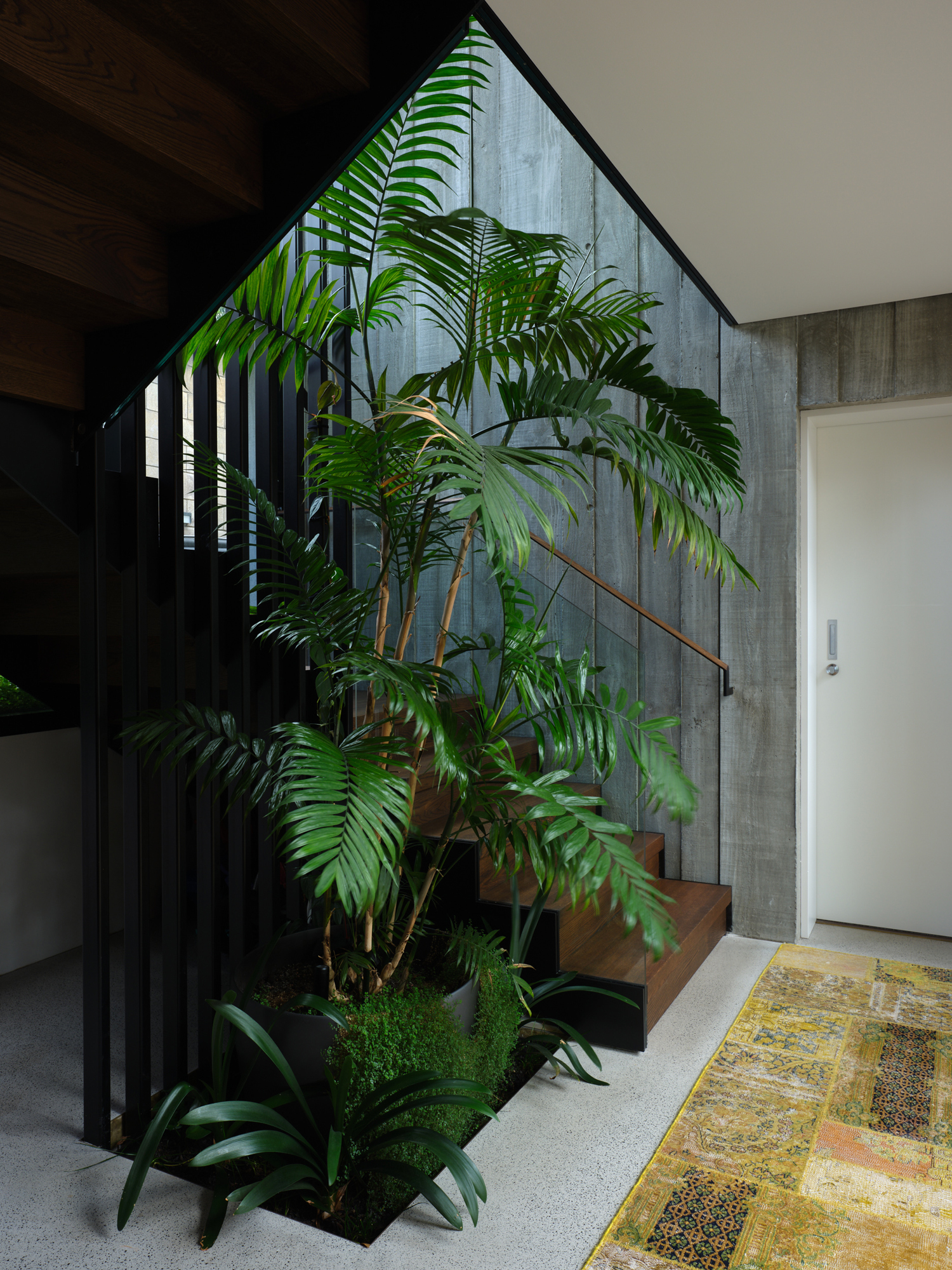 “But in order to get more generosity in the living space, we needed to push one of the blade walls closer to the boundary,” she explains, so new walls in poured concrete were instated.
