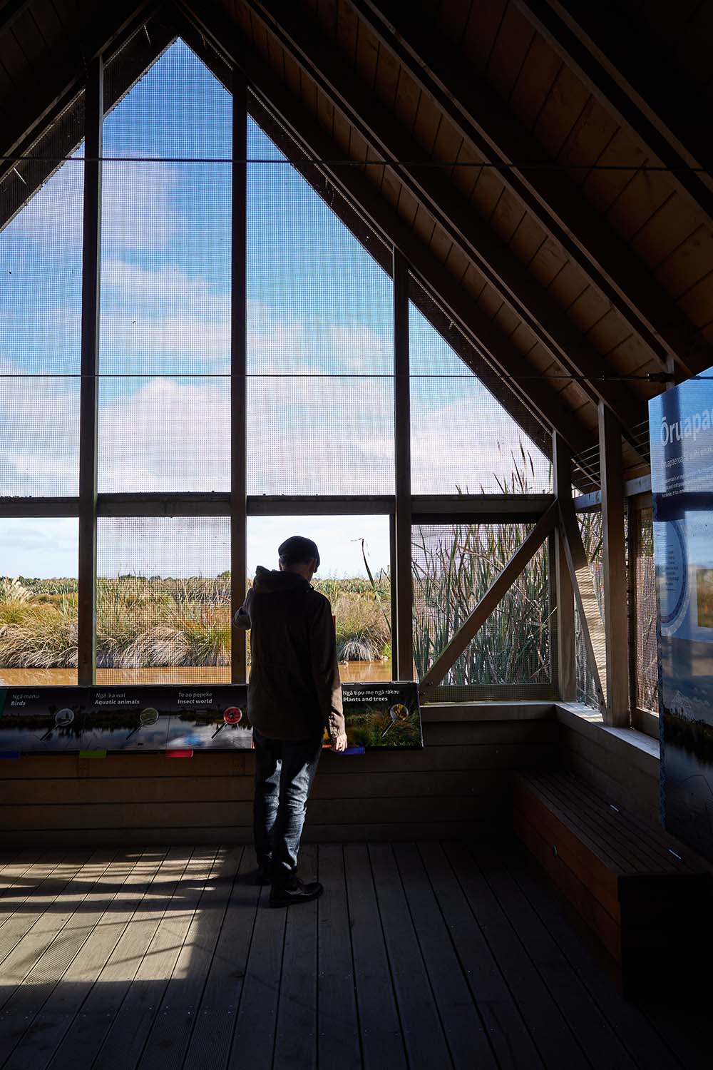 Our Open Christchurch tour finished at a wetland 20 minutes northeast of the CBD in a little, unassuming structure that hovers above a swamp. The initial impression is one of pared-back utilitarianism: a high-gabled, timber structure made to house educational materials about the context and birdlife that surrounds it. Yet, as architect Peter Kent began to describe his design intent, subtle details emerged slowly about a landscape of ideas and metaphors that influenced this construction: whare, Gothic, and Asian gable forms; tapered rafters that emulate wing tips while tensile steel acts like wing structures: bone and cartilage perhaps. The avian metaphor extended to talks about bird migrations and how this simple kiosk hopes to tap into similar memories of voyages undertaken by our own species, ancestors and the like.
