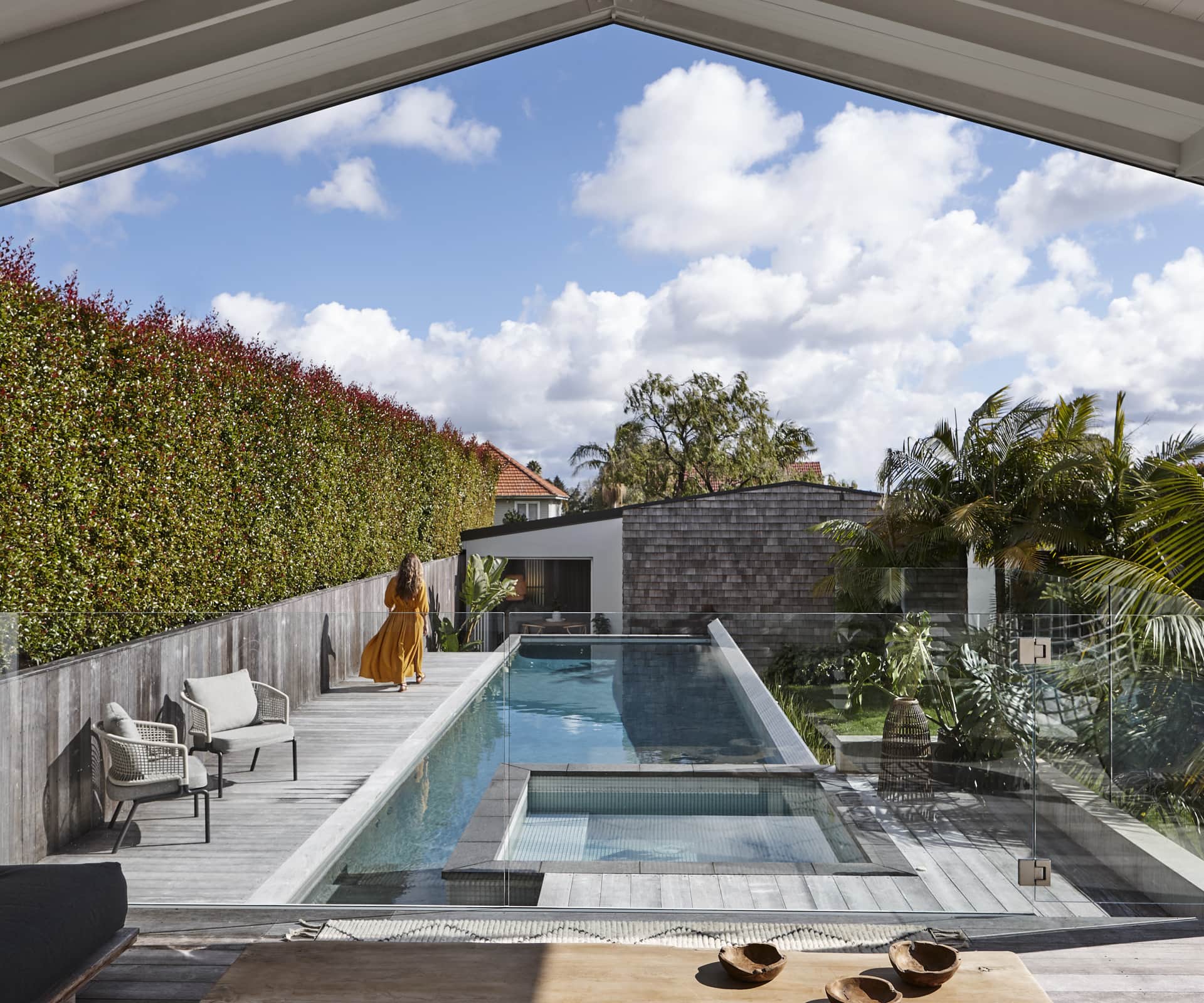 By building a raised pool to sit flush with the living area, this Westmere home’s poorly-used front yard is now the ultimate space for summer
