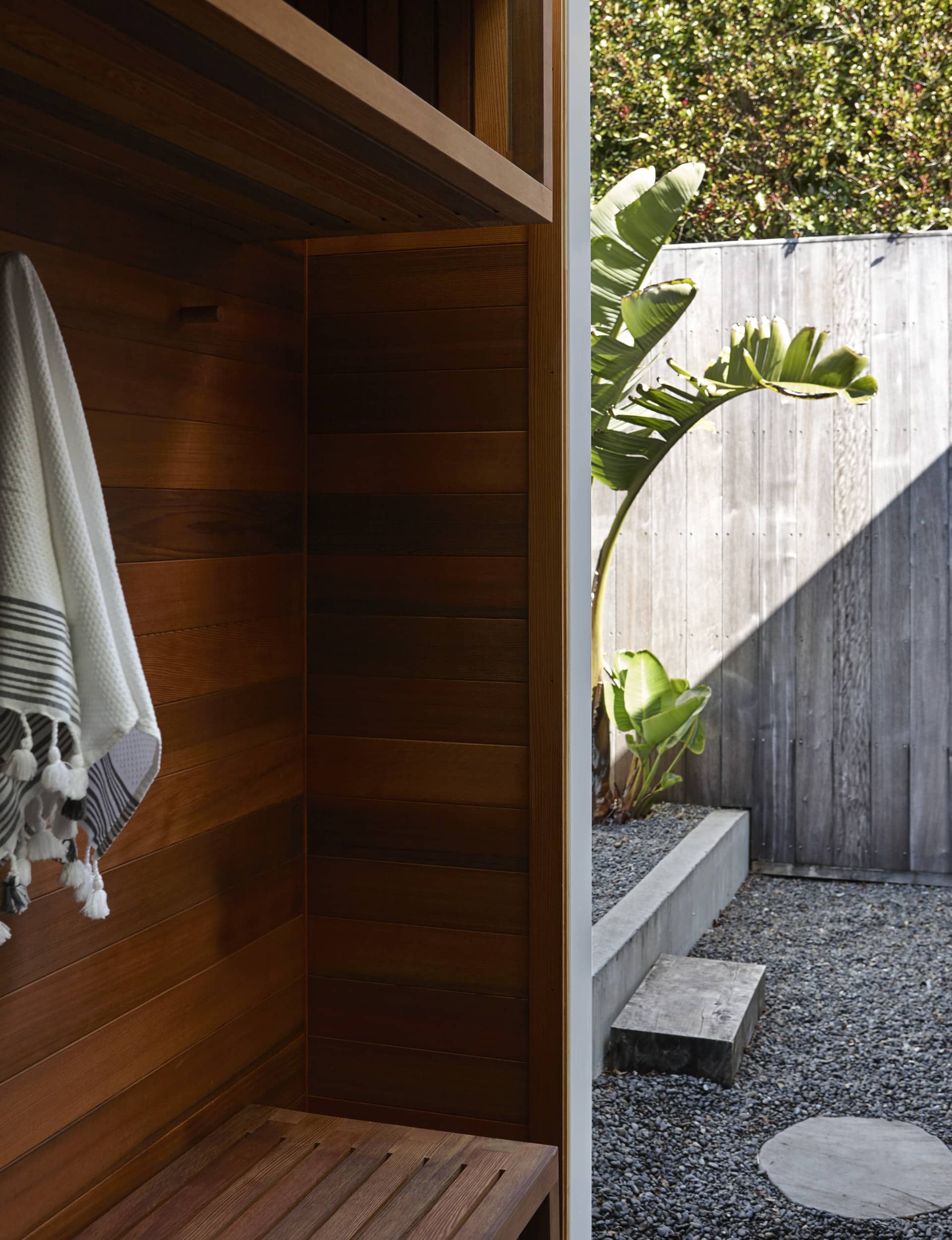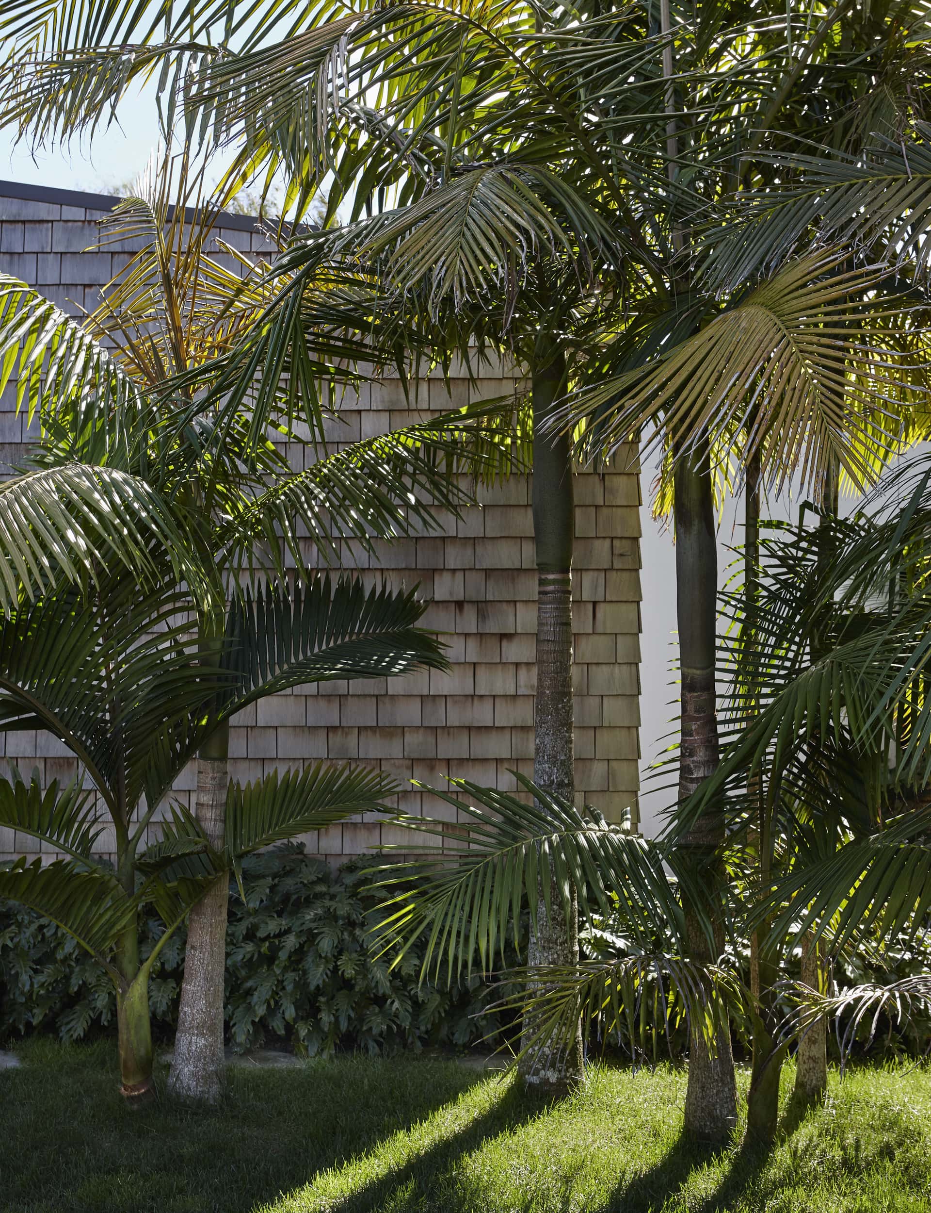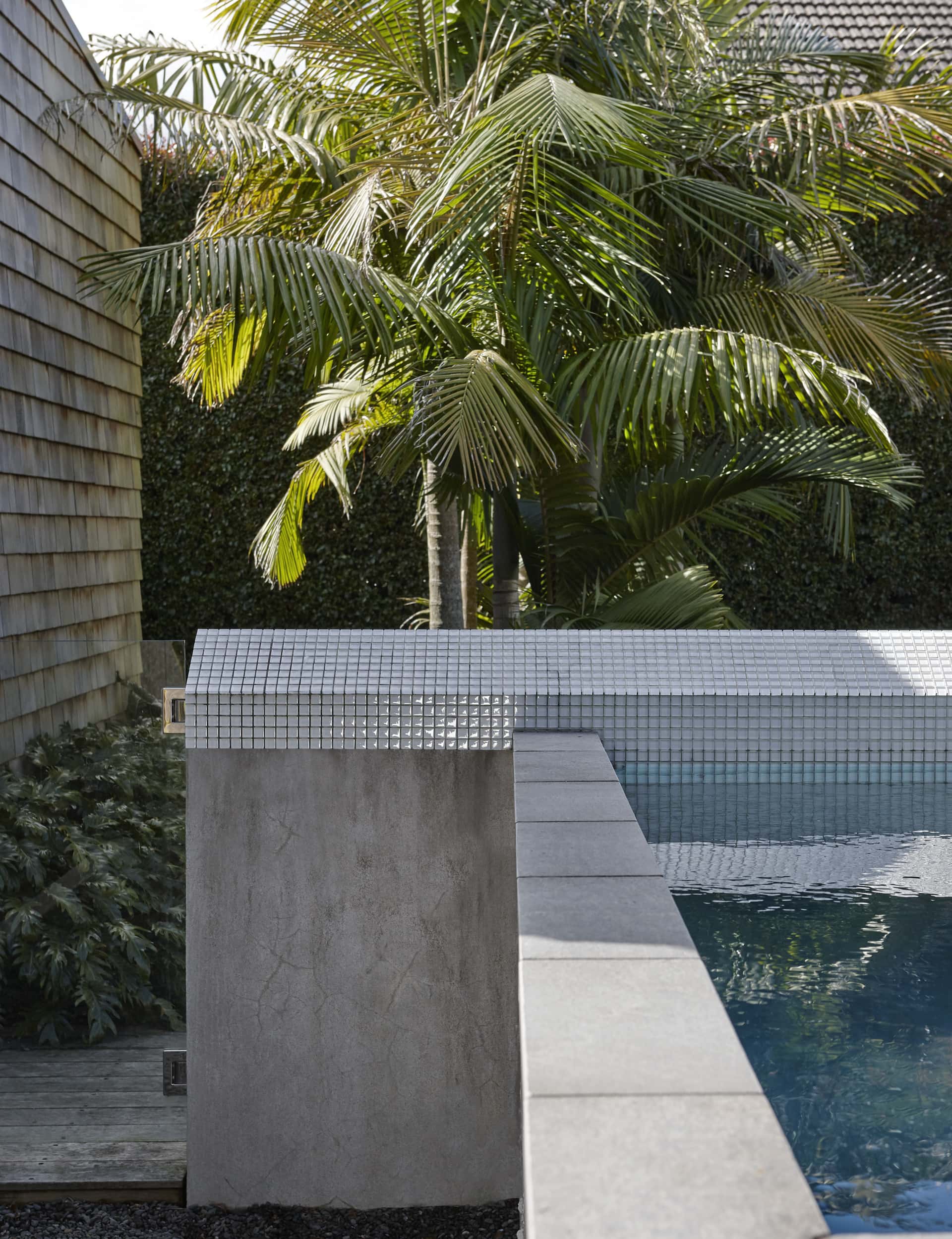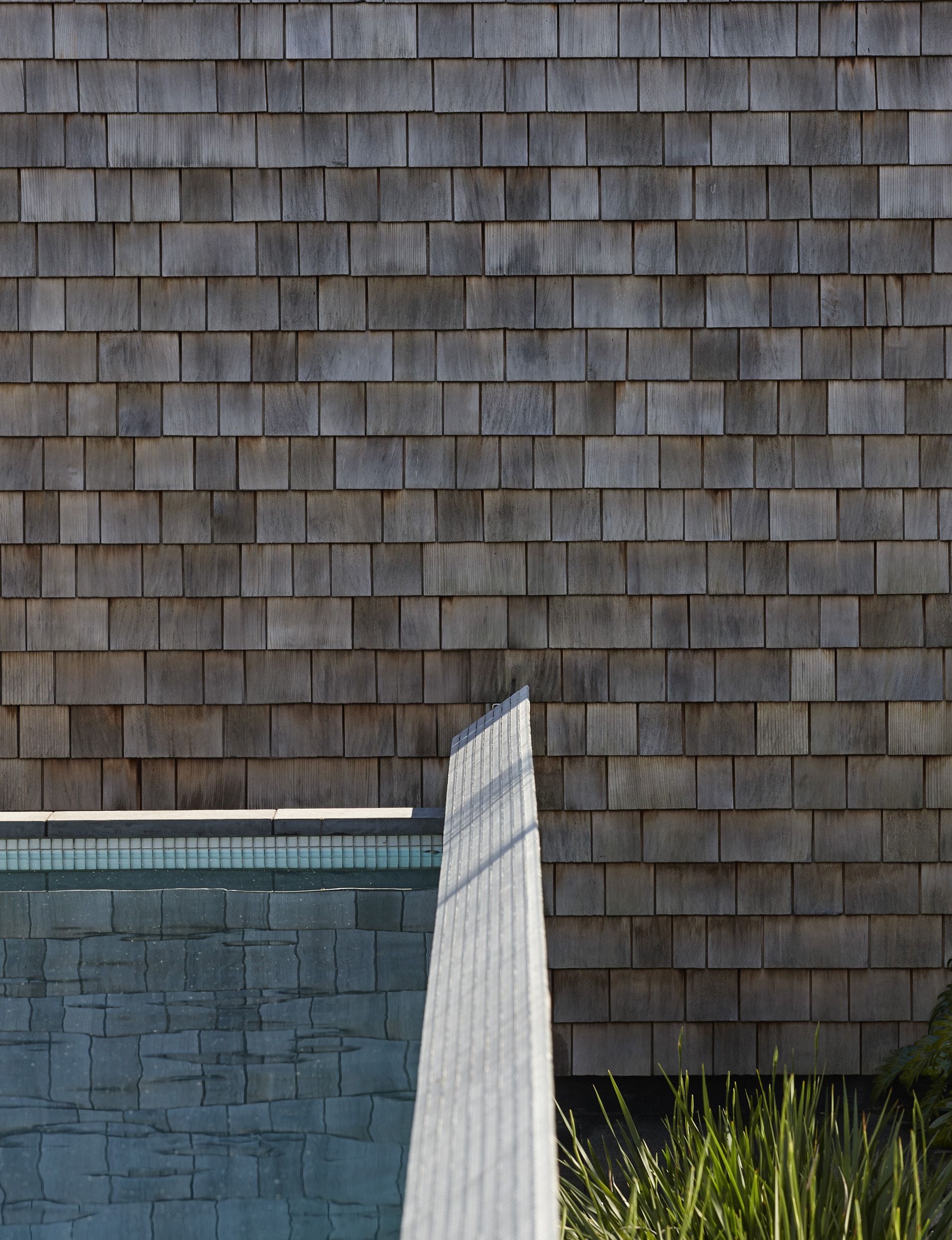We chose to clad the changing room and pool-room structure in cedar shingles, to soften and break down the scale of the existing garage façade, but – more importantly – to materially connect the existing house with its shingled gables to the garage structure. The off-shutter concrete finish of the pool walls was used as a backdrop to the lush planting of the moat.
