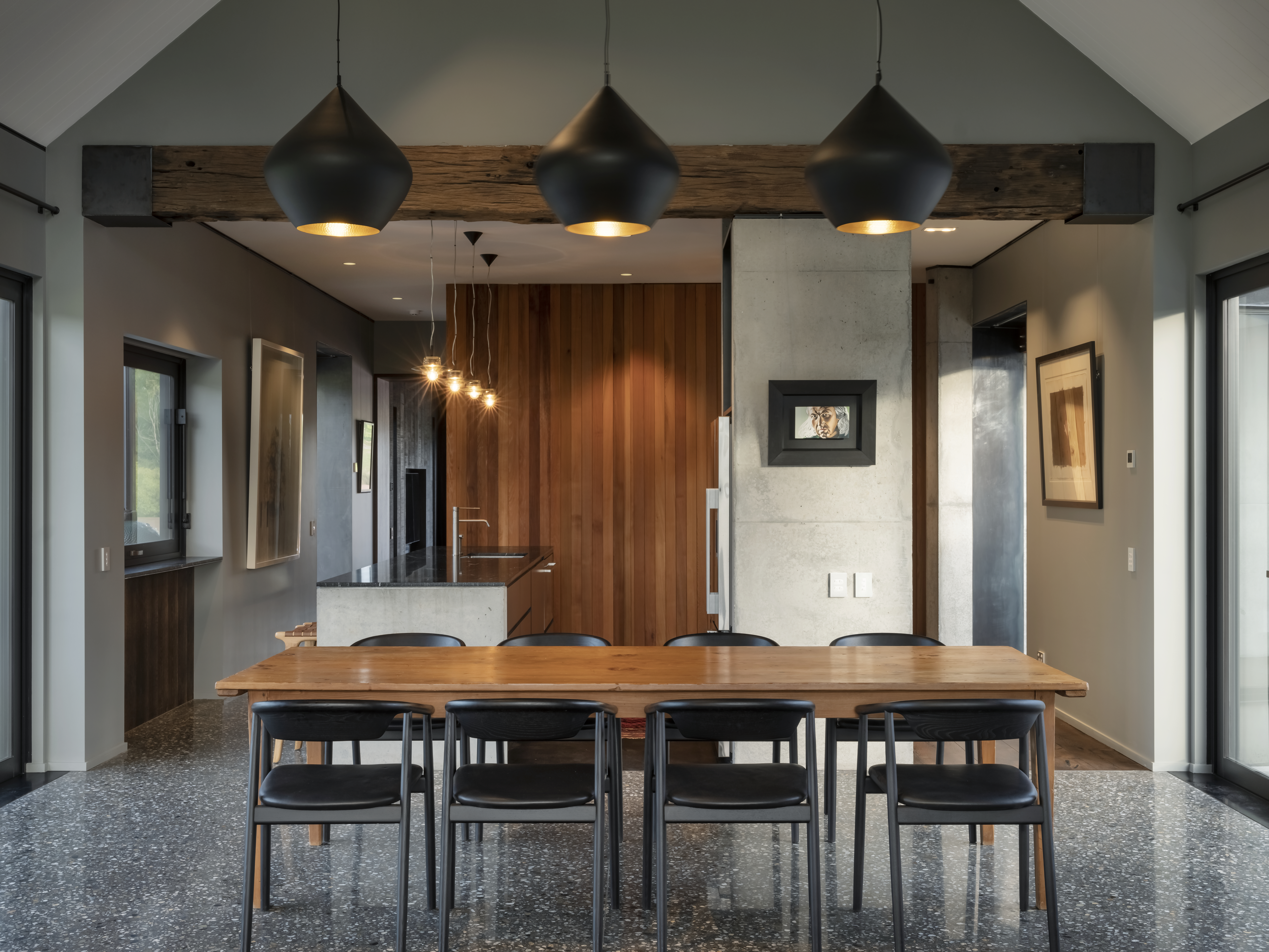 The natural irregularity of the aggregate and deep grey charcoal tonality combines with the rusticity of the timber, while bespoke steel hardware on barn-style hanging doors and on brackets, and the rhythmic patterns of the steel bracing in the walkways form a highly tactile repose.