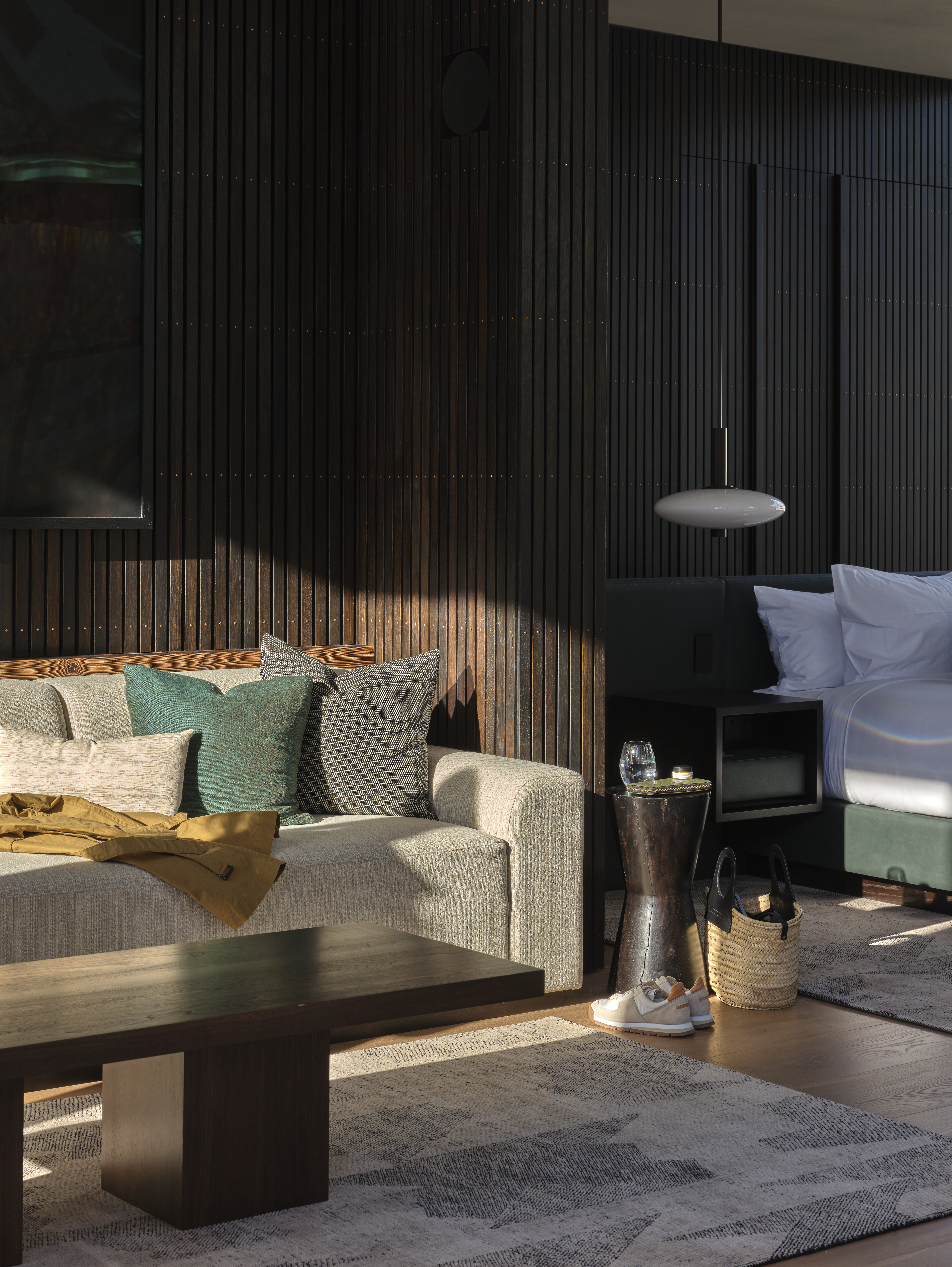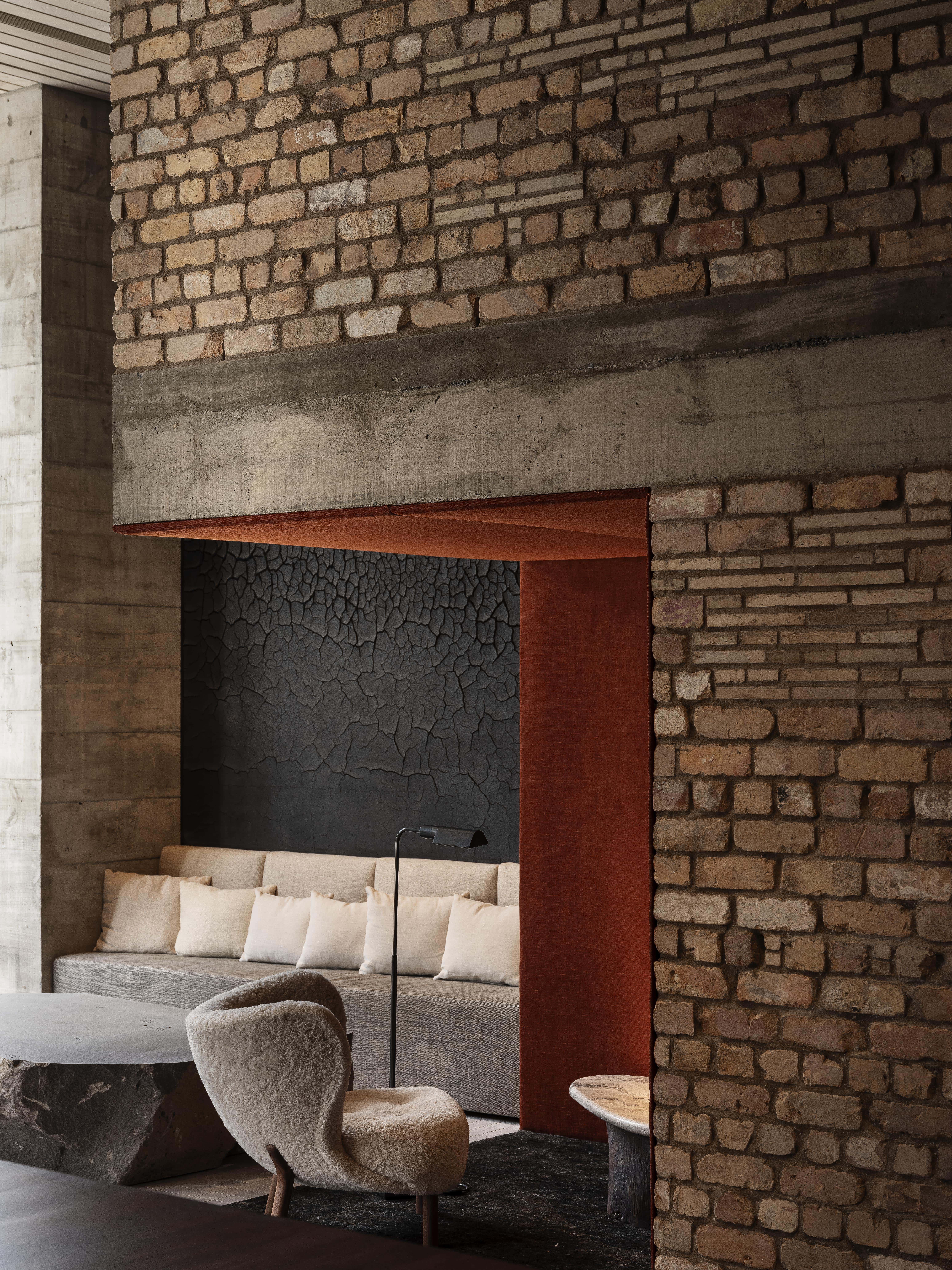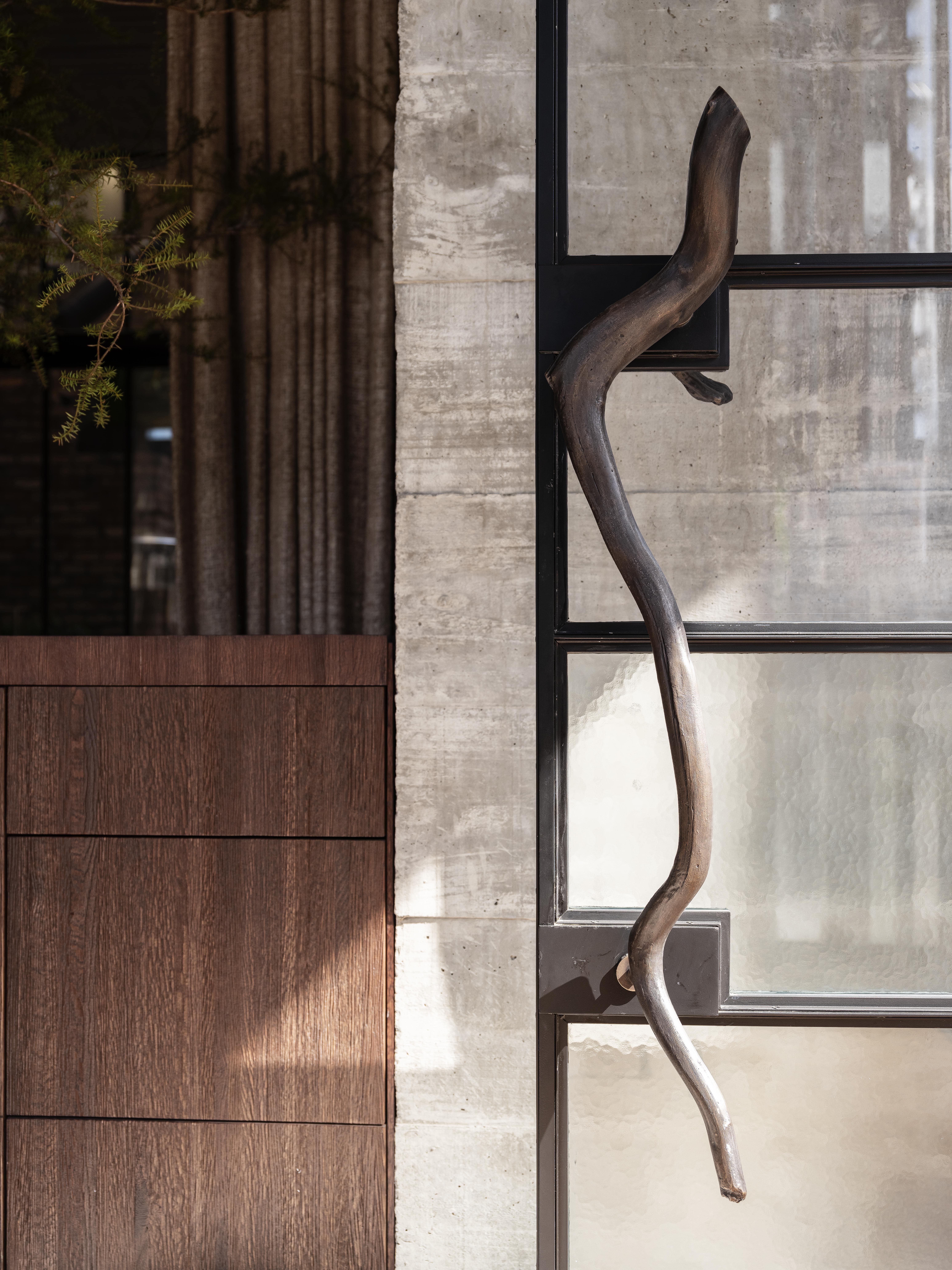 We see: burlap, exposed concrete pillars, a window bench made out of salvaged timber beams, glass and steel, a raw boulder forming a coffee table, bluestone pavers that spill from the sidewalk into the lobby and then smoothly transition into coarse carpet. The level of customisation and attention given to every touchpoint here is impressive, yet it is something as basic as door handles which bring home the fact that this interior is personal, a labour of love of sorts for a massive number of stakeholders.
