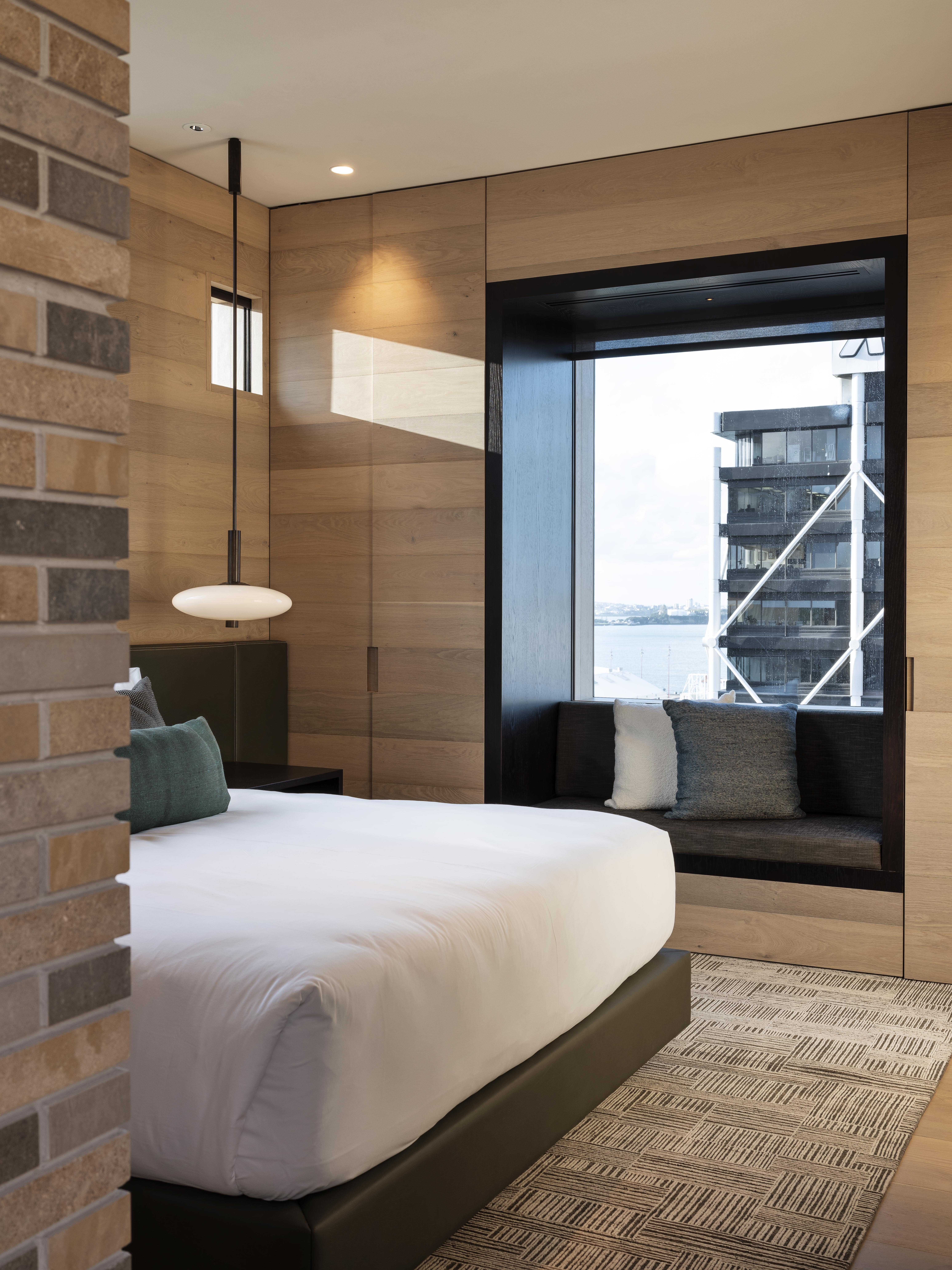 “The hotel is small,” says Dajiang Tai, lead designer for the project, “so it is natural that there wouldn’t be swimming pools and restaurants and gyms … but if you zoom out and treat the entire Britomart as part of the hotel … then the hospitality experience starts as soon as you step into the precinct rather than just into the lobby.”