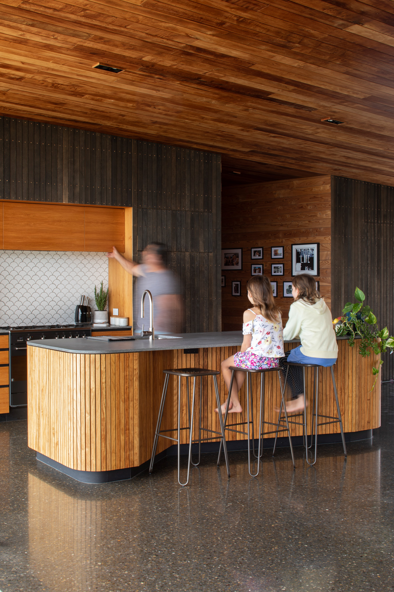 The rock seam is a key feature of the impressive outdoor area to the south of the home that feels hunkered down and protected, helped by the sweeping roof eaves being closest to ground on this side of the house and the fact that the southern areas of the home sit into the landscape here. A continuous overarching roof plane, the single level, flush flooring of polished concrete inside and Vitex decking outside, and a cohesive timber palette across the property create a symbiotic relationship between external and internal spaces.