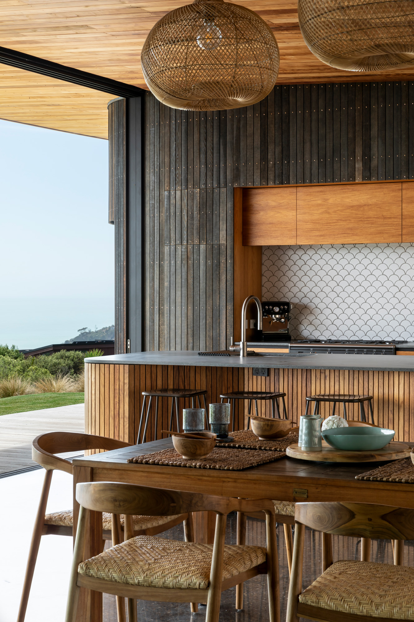 On the northern side, the timber deck, lush grass, and views of the Pacific are liberating.