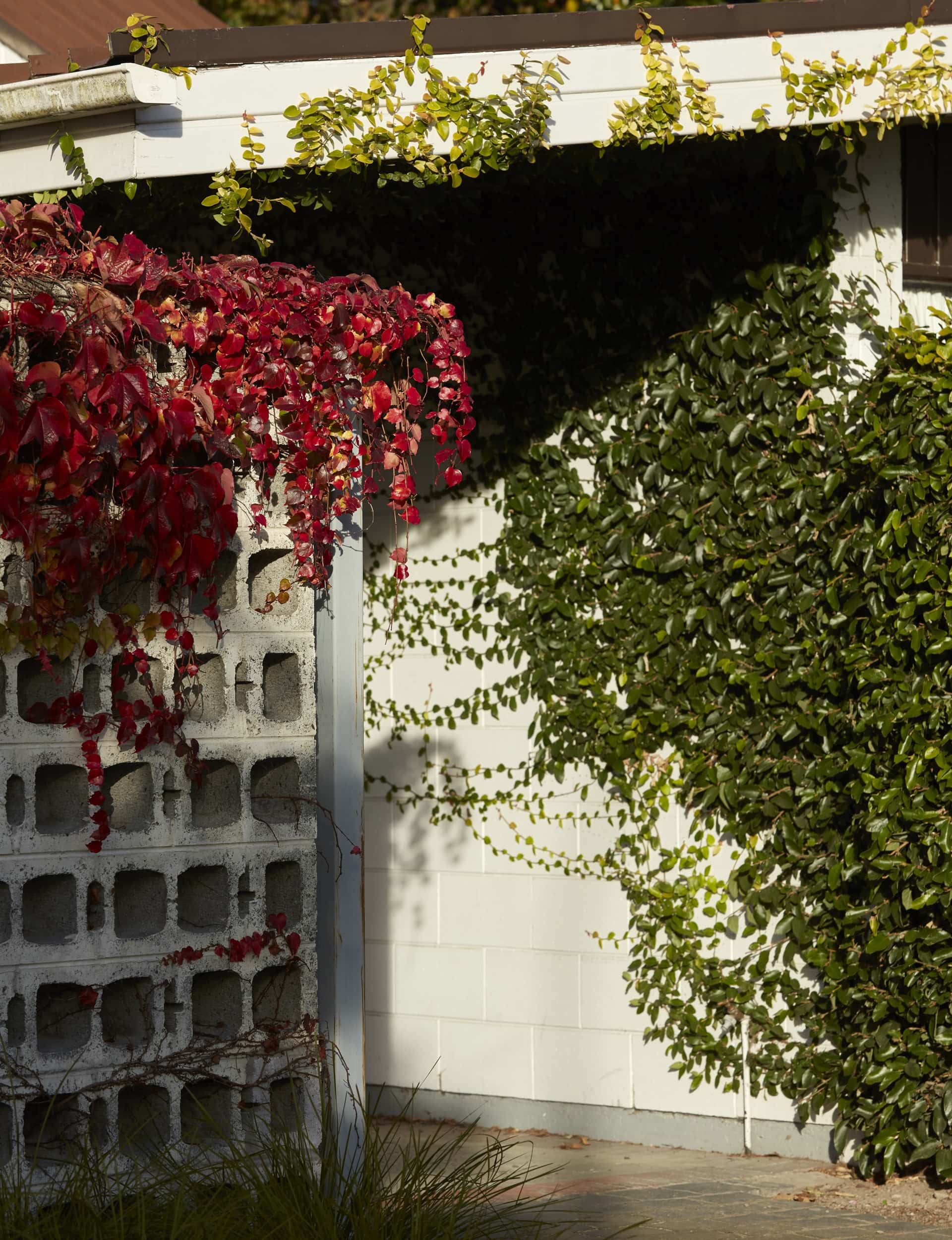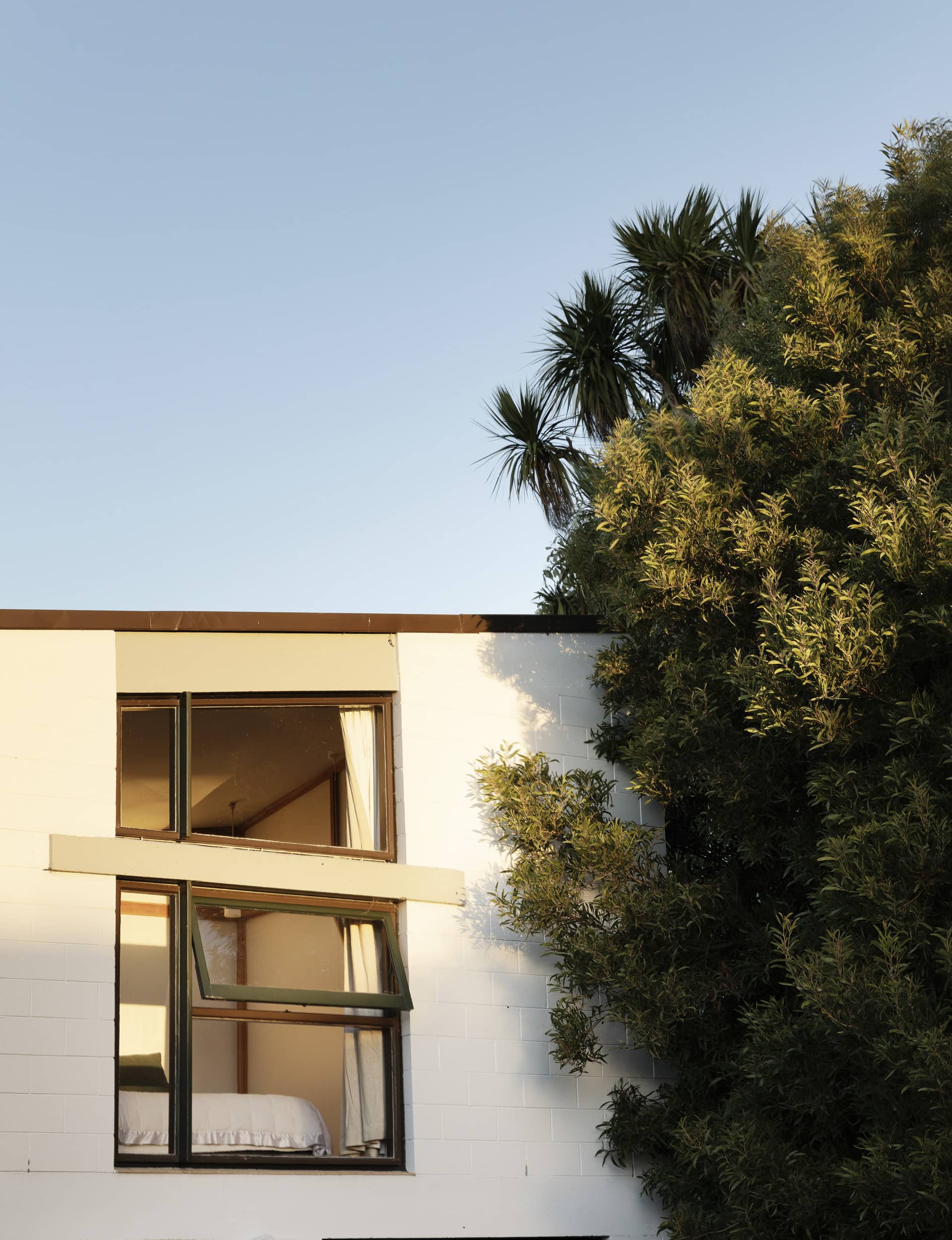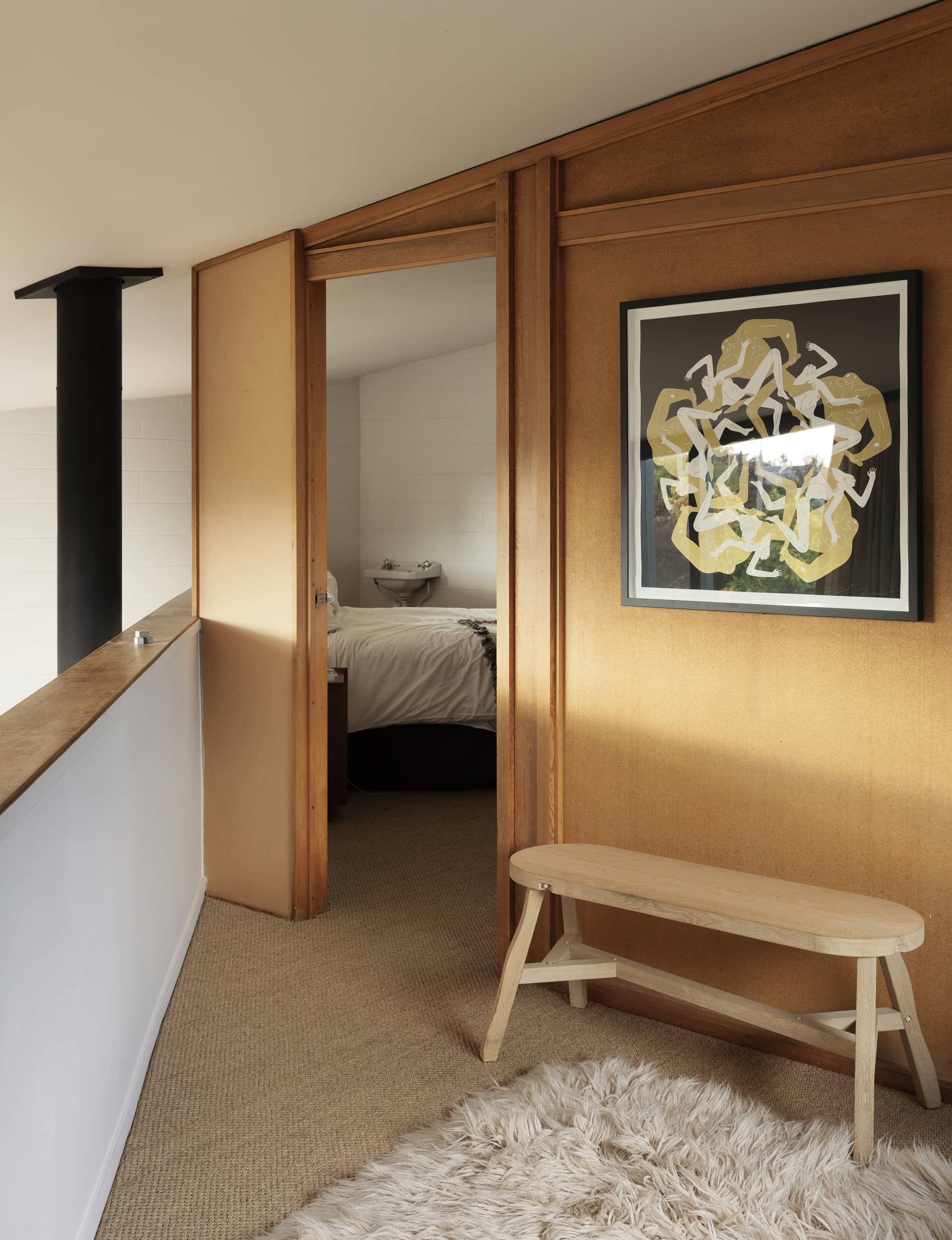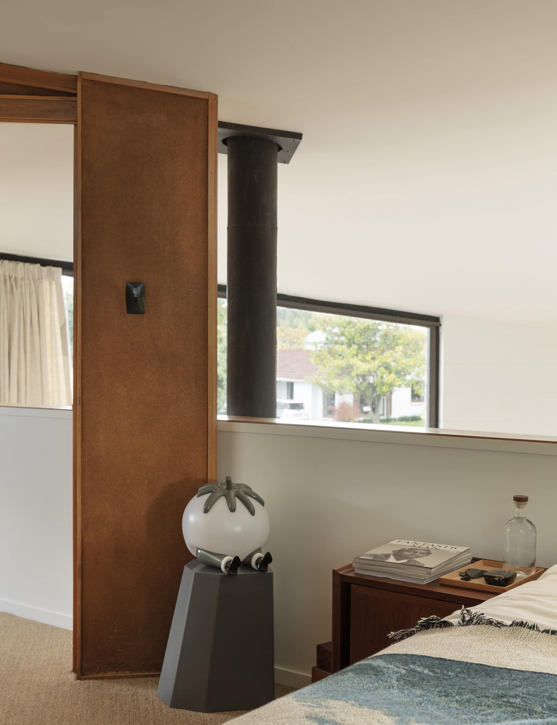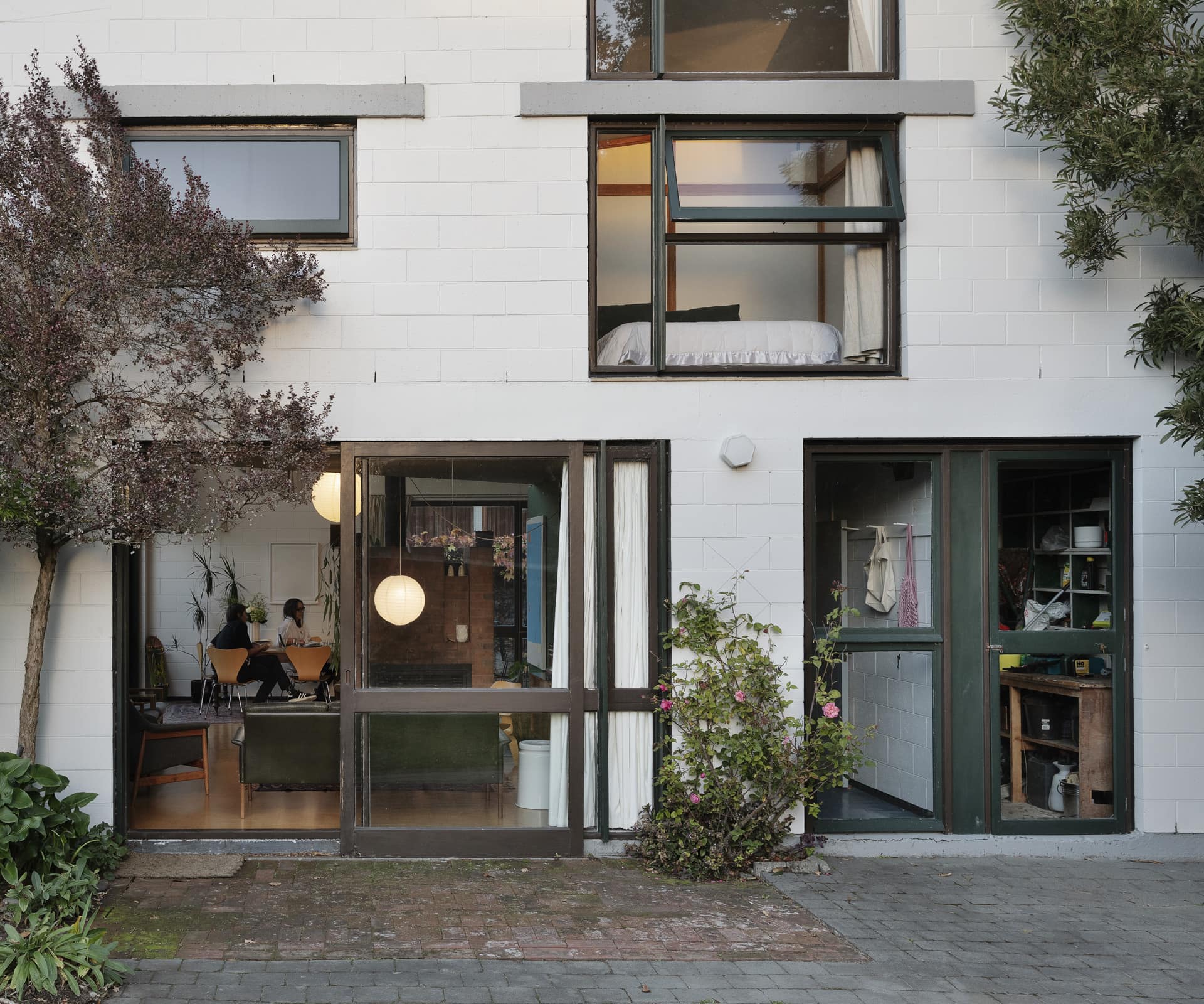 MA— It’s a fun design and an original expression of the Christchurch Style. The mezzanine, which runs diagonally above the double-height living room, is a big feature. Along with the red-brick fireplace that divides the space, it’s a practical heat sink and the exposed flue acts as a radiator upstairs, too. There’s glass on three sides, the sun streams in and large sliding doors open into private courtyards. These are common ideals of how people like to live today, I think, but it was highly unusual in New Zealand at the time.