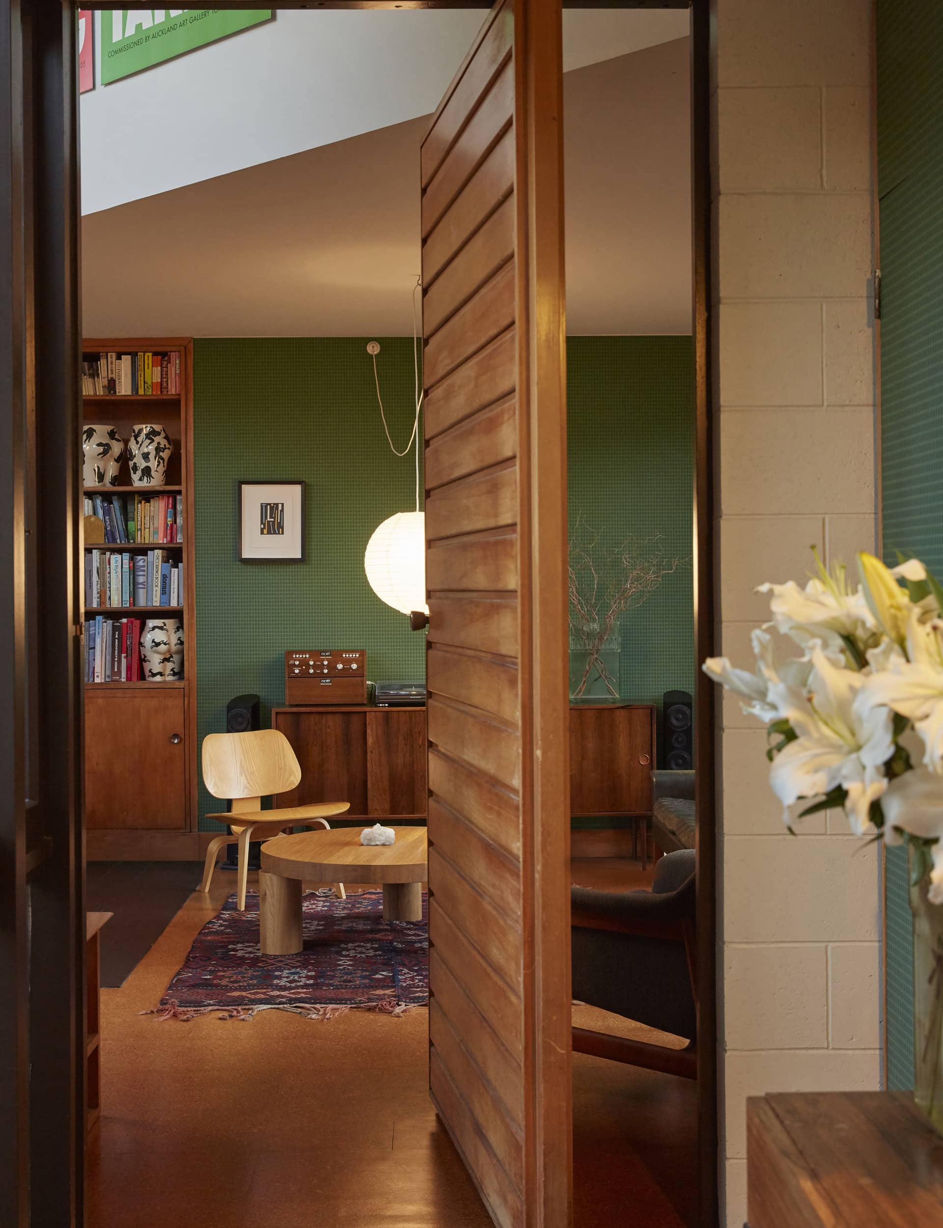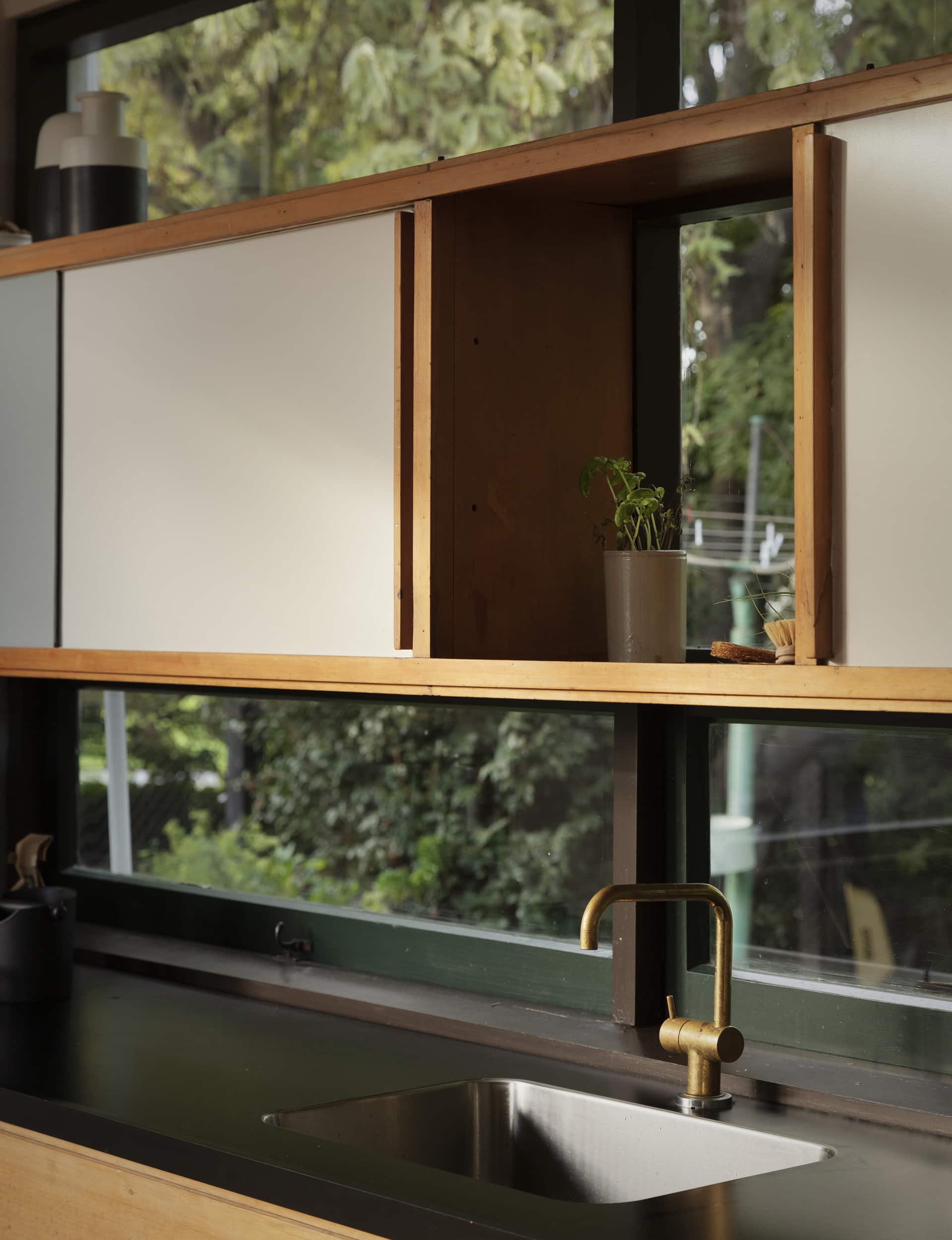Prue Johnstone— The unique form was different to anything I had seen in Christchurch. While it shares similarities with other local mid-century houses, it’s a departure from the more traditional gabled forms. I had seen photos of the house while Biddy Messervy owned it and it had always stuck with me. Inside, I remember being surprised around every corner. The double-height space with the open mezzanine was dramatic and the use of colour throughout makes you smile. A feature of mid-century houses I have long admired is built-in joinery. The kitchen in the Messervy House is a particular highlight – the joinery floats above the bench and frames views to the garden and park beyond.