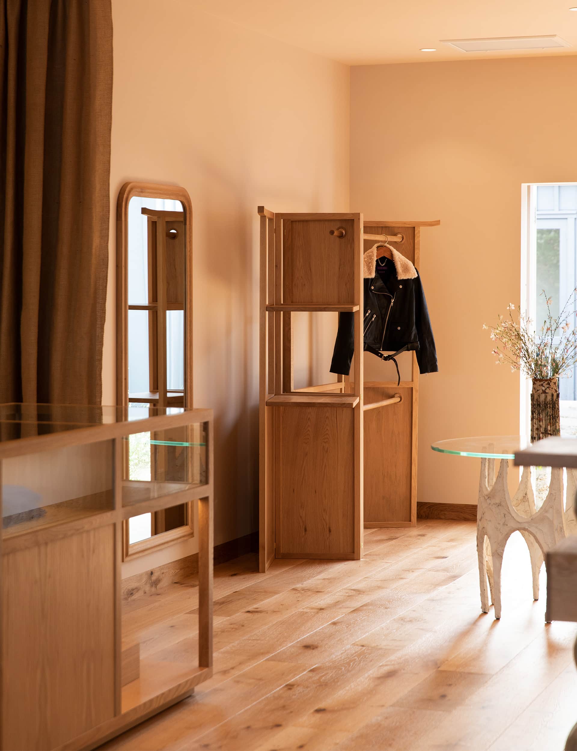 The walls are a soft white, the floors are oak and so are the built-in shelves, on which you’ll find art and ceramics along with leather goods and accessories. Lockhart also sourced antique Japanese display cases from Kyoto, which have a handmade, aged quality to them. “Previously, we’d placed a lot of emphasis on colour,” says Bowden. “This time it’s more about natural materials, warmth and a familiarity.”
