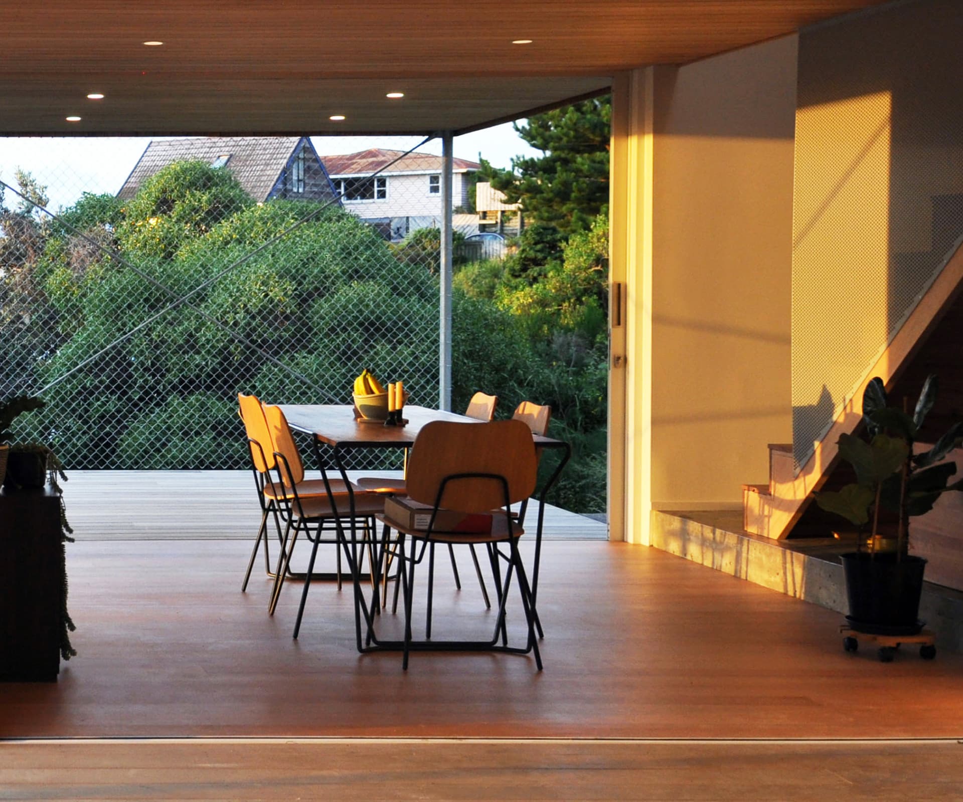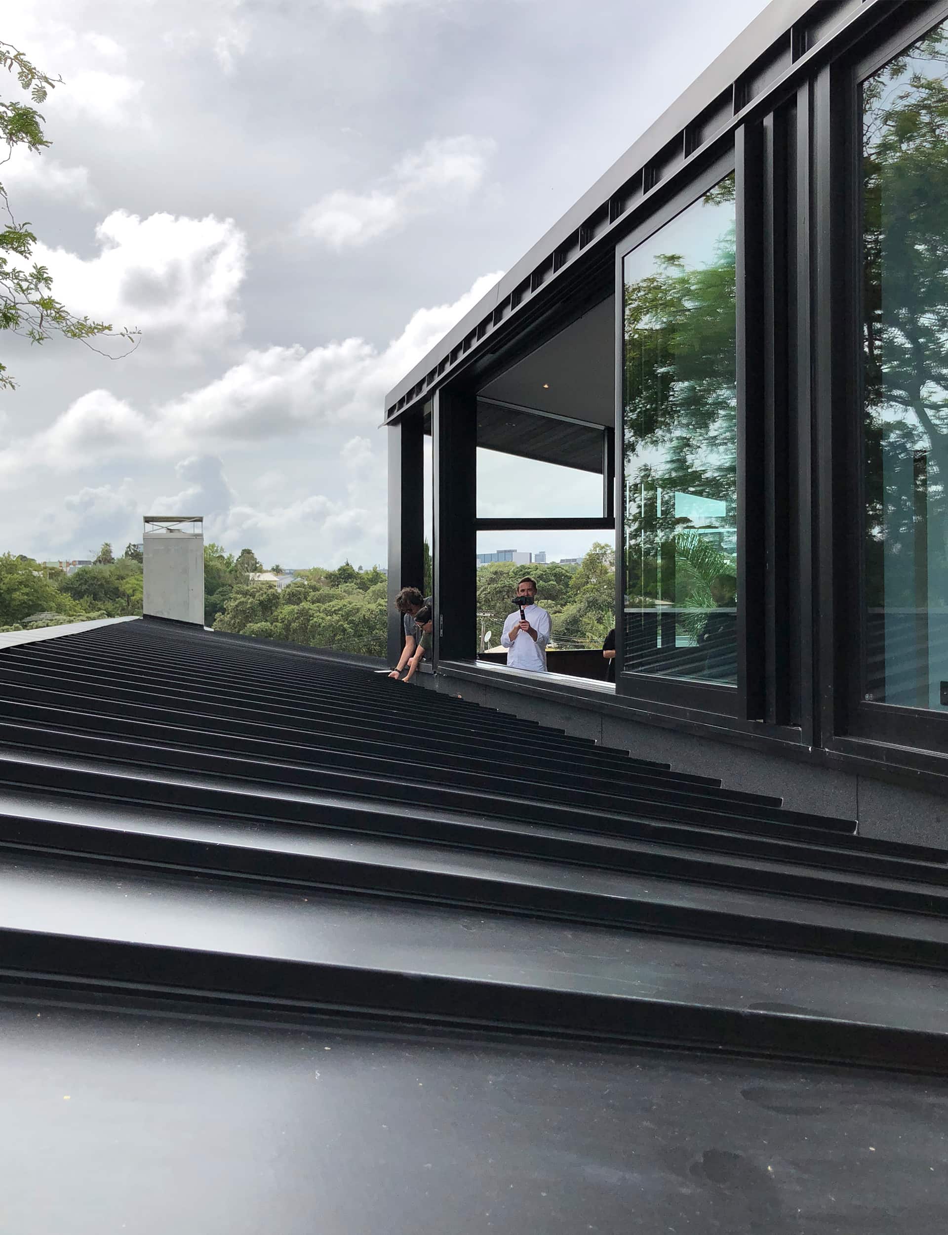 “A striking roof of in-situ concrete floats above expansive living areas, contrasting with polished steel. A classically Auckland house designed around friends and family, with a sense of fun.”