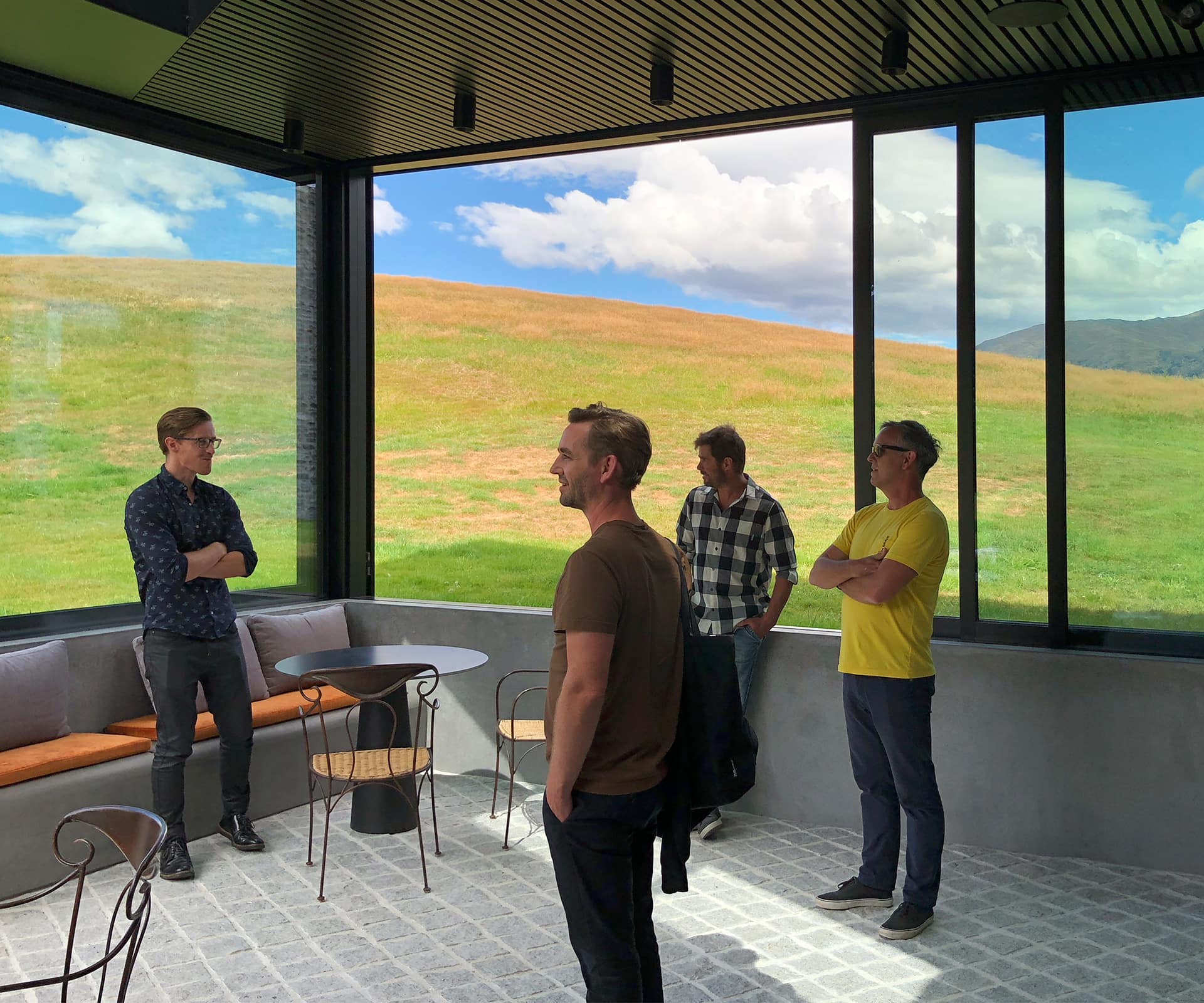 It was one of those gloriously dry Central Otago afternoons: the hills were brown, the sun was yellow and the sky was blue. This made the arrival at the Arrowtown House by Richard Naish all the more spectacular – you approach on a long, gravel road and ascend the steps into quite a formal courtyard, around which are scattered five individual structures.