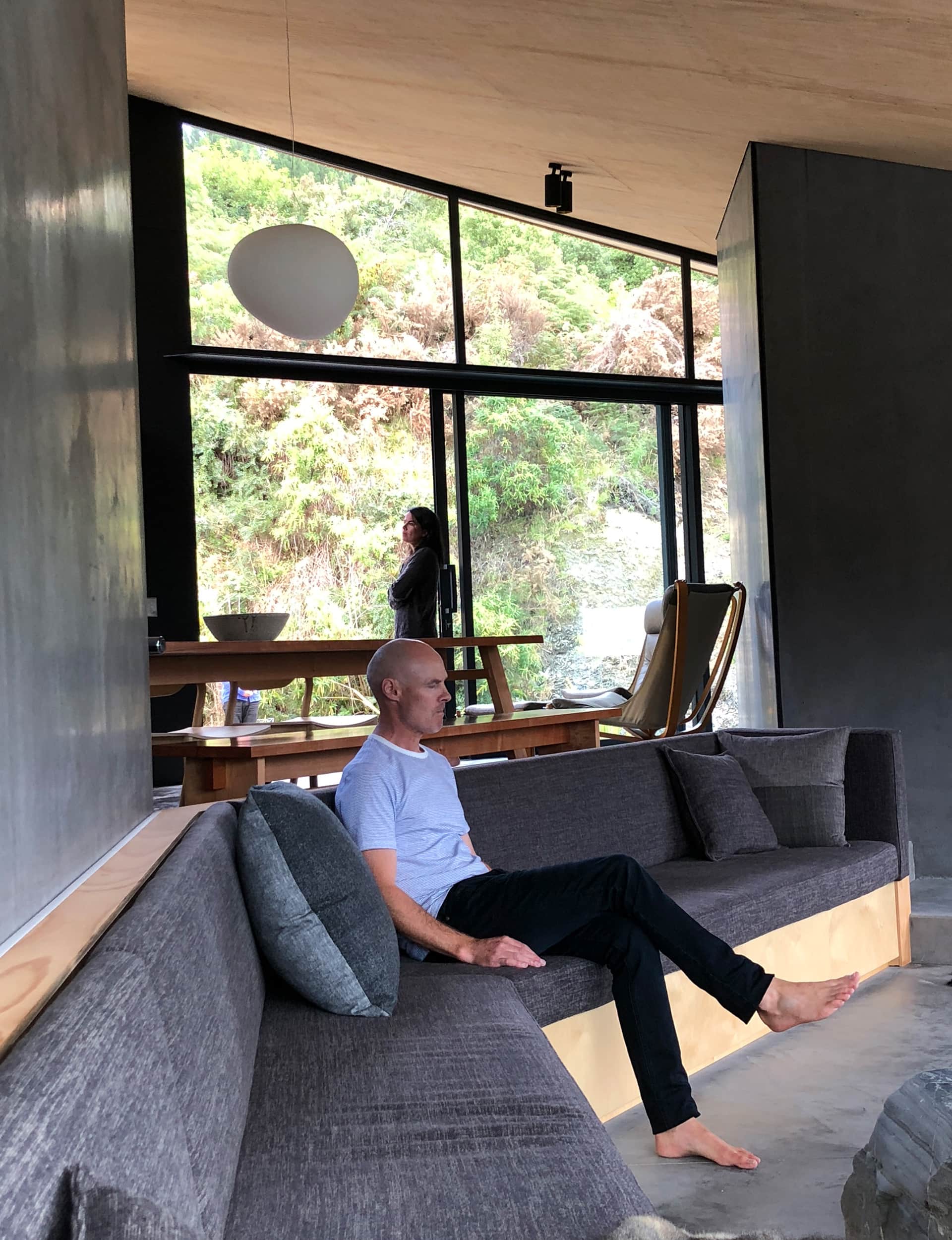 We finally arrived at Vaughn McQuarrie’s Bivvy Hut – a fractured, twisted house built from tilt-slab concrete that seems to rise from the very rocks the building site was hewn from. Inside, the theme continues, with rough-sawn ply on the walls and oddly shaped door openings that force you to slow down and make your way through.