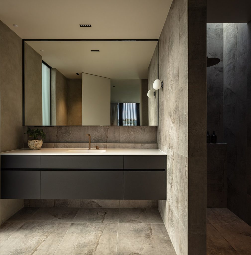 Decorative wall lights were selected for the bathrooms, in conjunction with the Laser Blade downlights: the Gregg Wall Light by Foscarini. “It’s an unusually-shaped opal glass mount that provides a nice, warm glow. Again, it’s a subtle piece that adds to the moodiness of these spaces.”