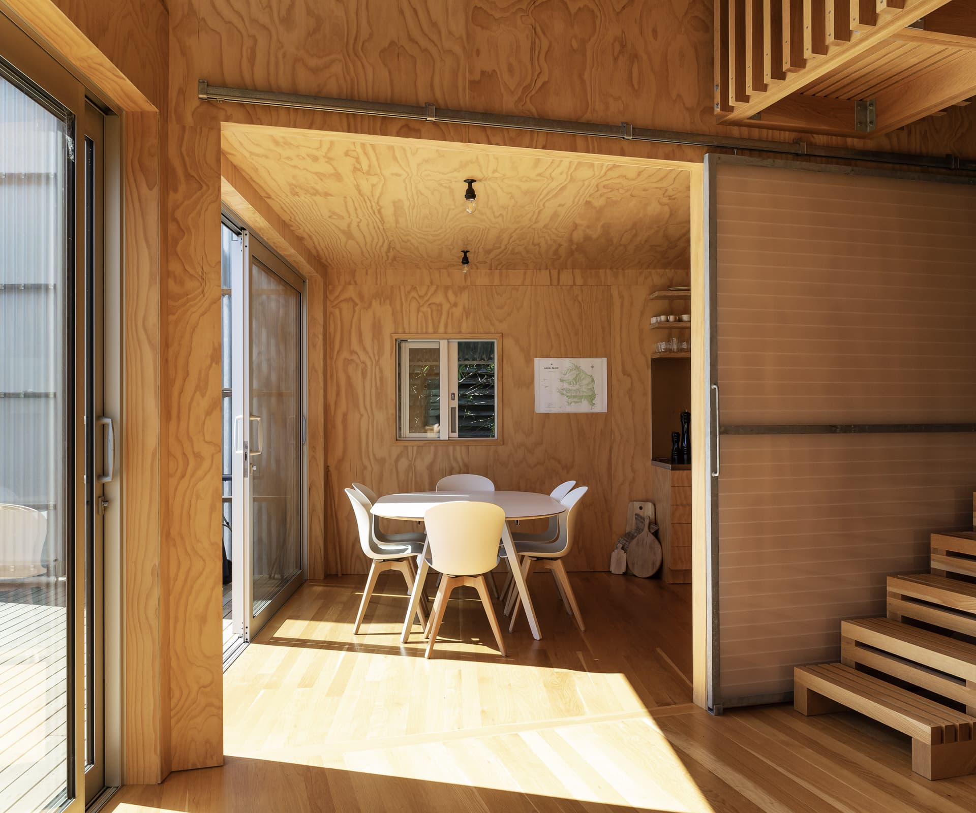 The doors also shelter the verandah from the wind and obscure views to neighbouring houses. From here, you get a perfectly framed view of Harris Bay, with no other house in sight. Inside, a diagonal line slices the square house in two, creating a series of angular spaces. Fewer angles would have called for much less design work – it would have been more conventional to run the staircase up one side of the house, or up the middle, leading to conventional square rooms, but much less experiential. “There’s a sense of slow contemplation and meandering through the place. It set up a number of interesting relationships between the spaces and a really lovely dynamic,” says Caradus.