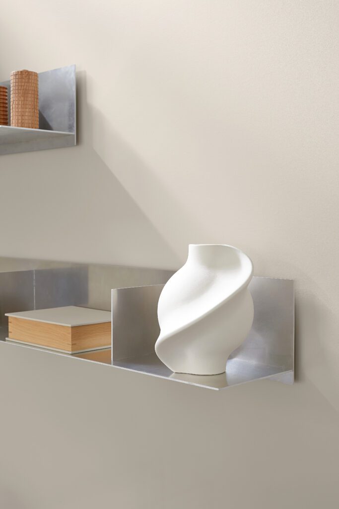 The generous scale of a wall that had once displayed art became the perfect backdrop for the untreated aluminium shelves, which blend legible forms, utility, and sculpture in pieces that will patina over time, taking on the stories of their environs.