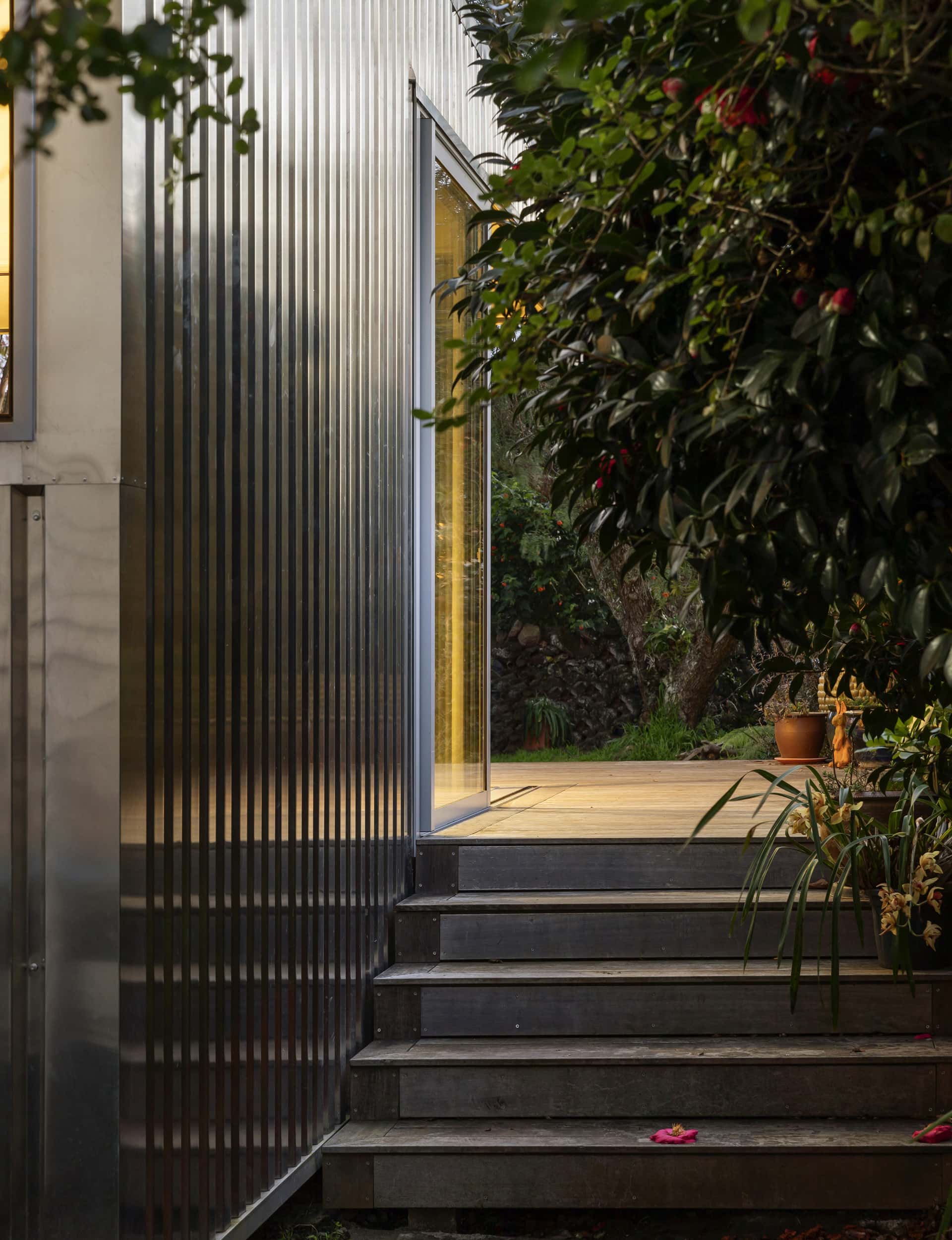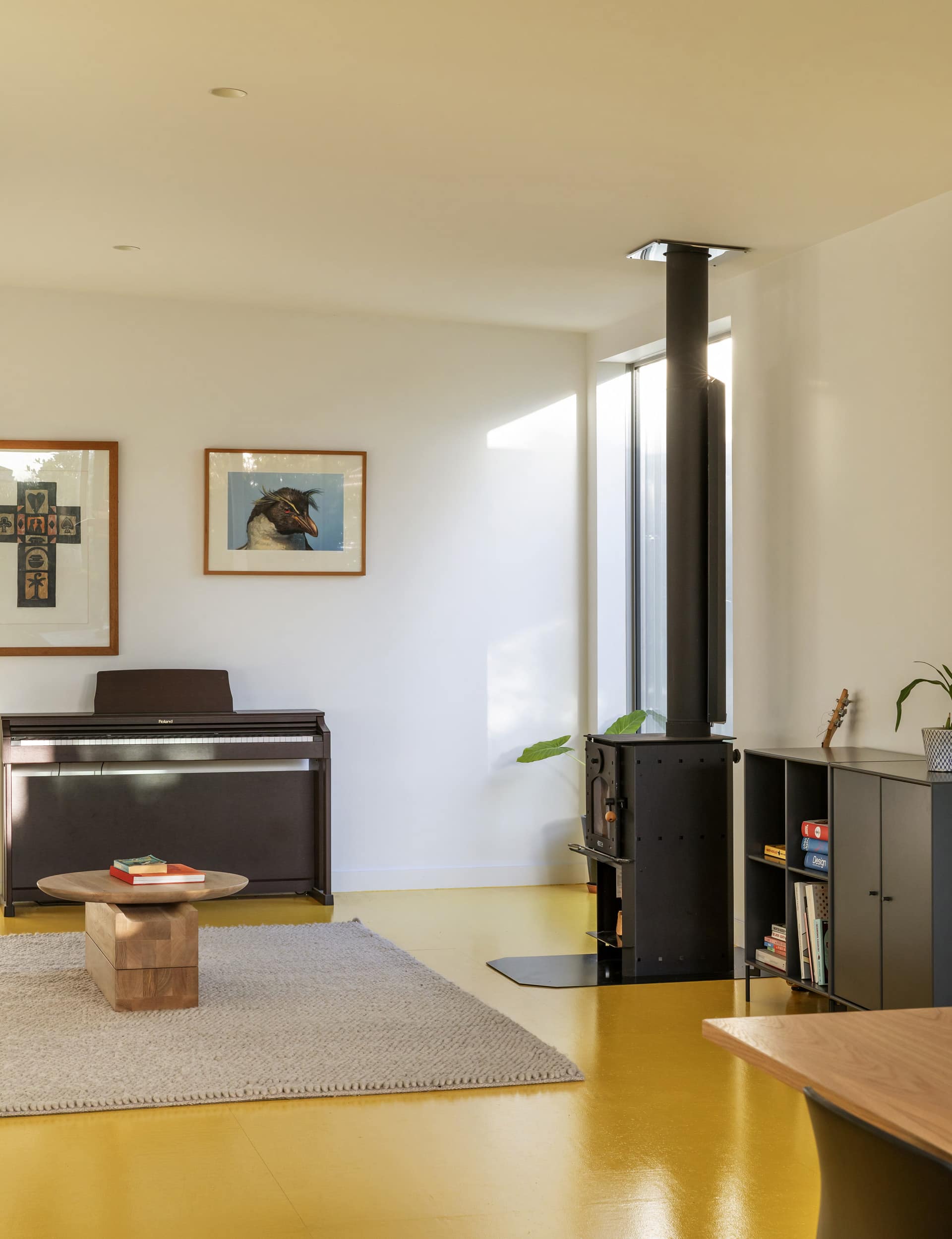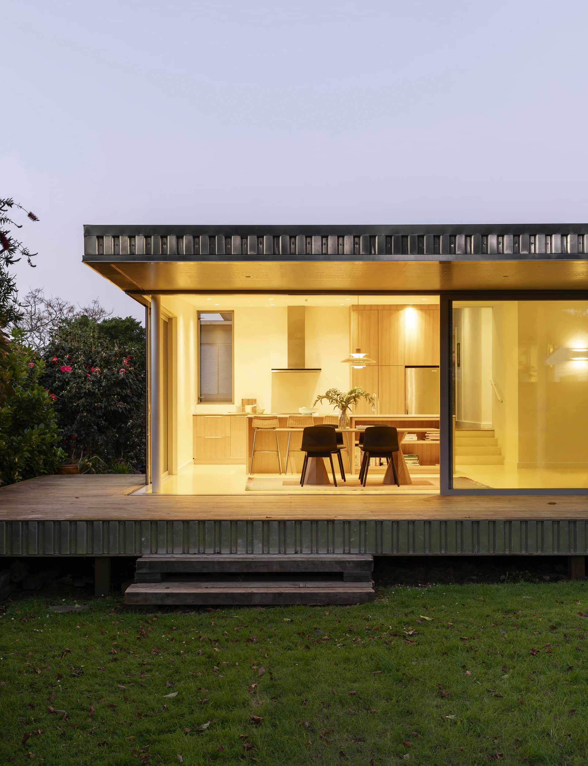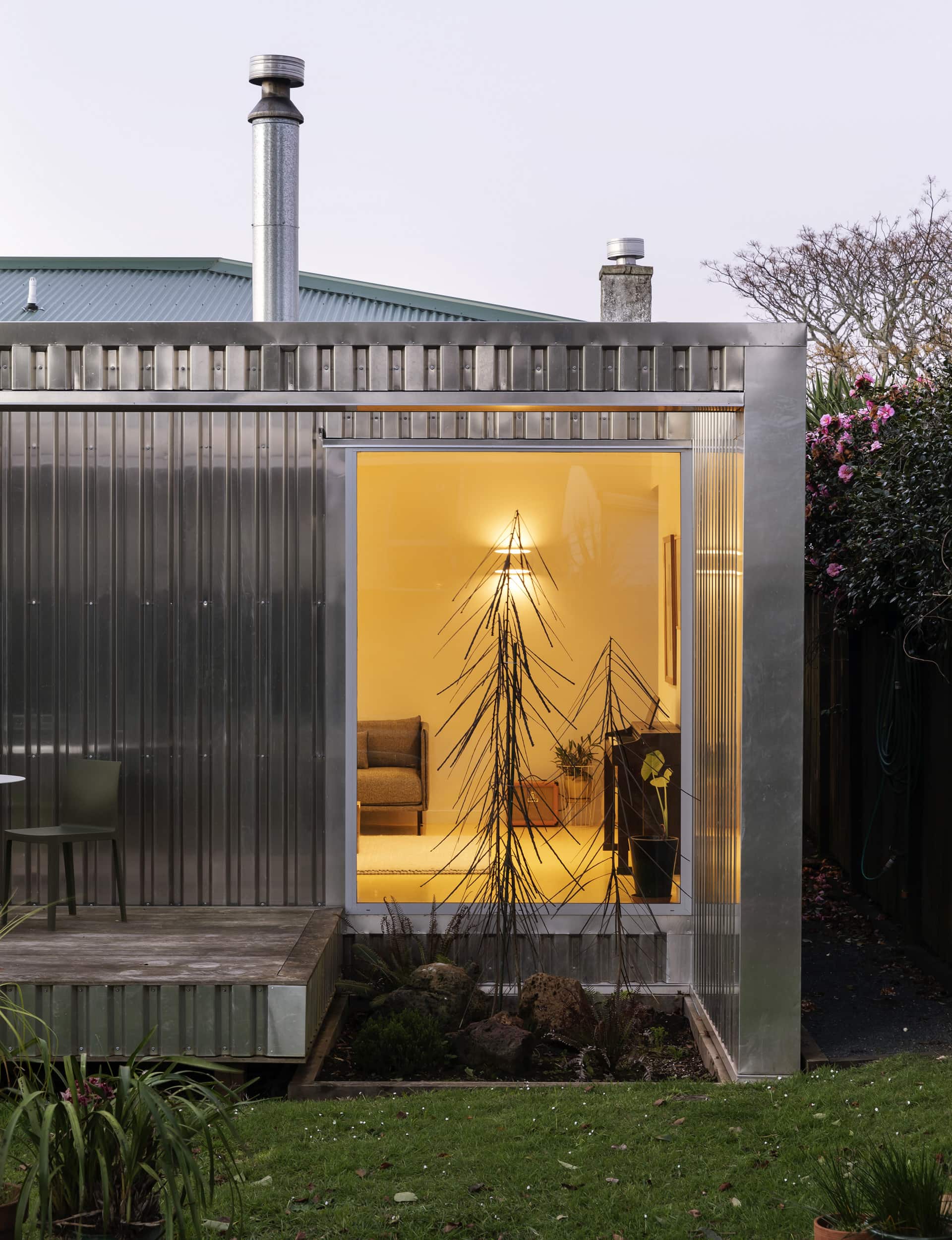 Aaron Paterson— Good design is more important than expensive materials. Where budget is a key concern, we focus on getting more bang for buck. This means first getting the planning and interior volumes just right. Then we explore the use of everyday materials composed in fun ways. The painted yellow Strandboard floor and plasterboard walls with raw aluminium exterior all come together in a simple, but fun addition.