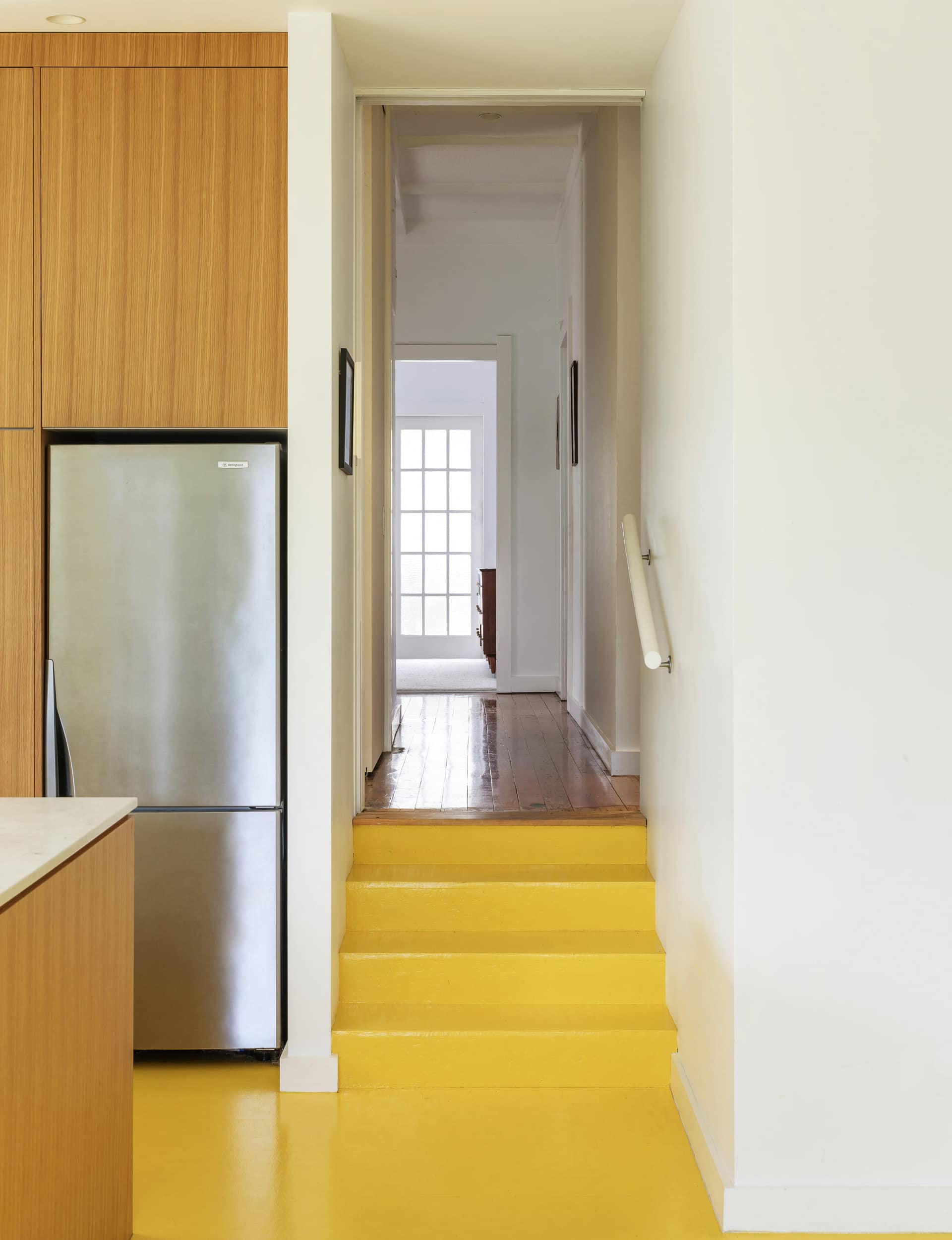 The architects from Pac Studio deploy light and fun through materials for a bungalow extension. See its bright yellow floors below