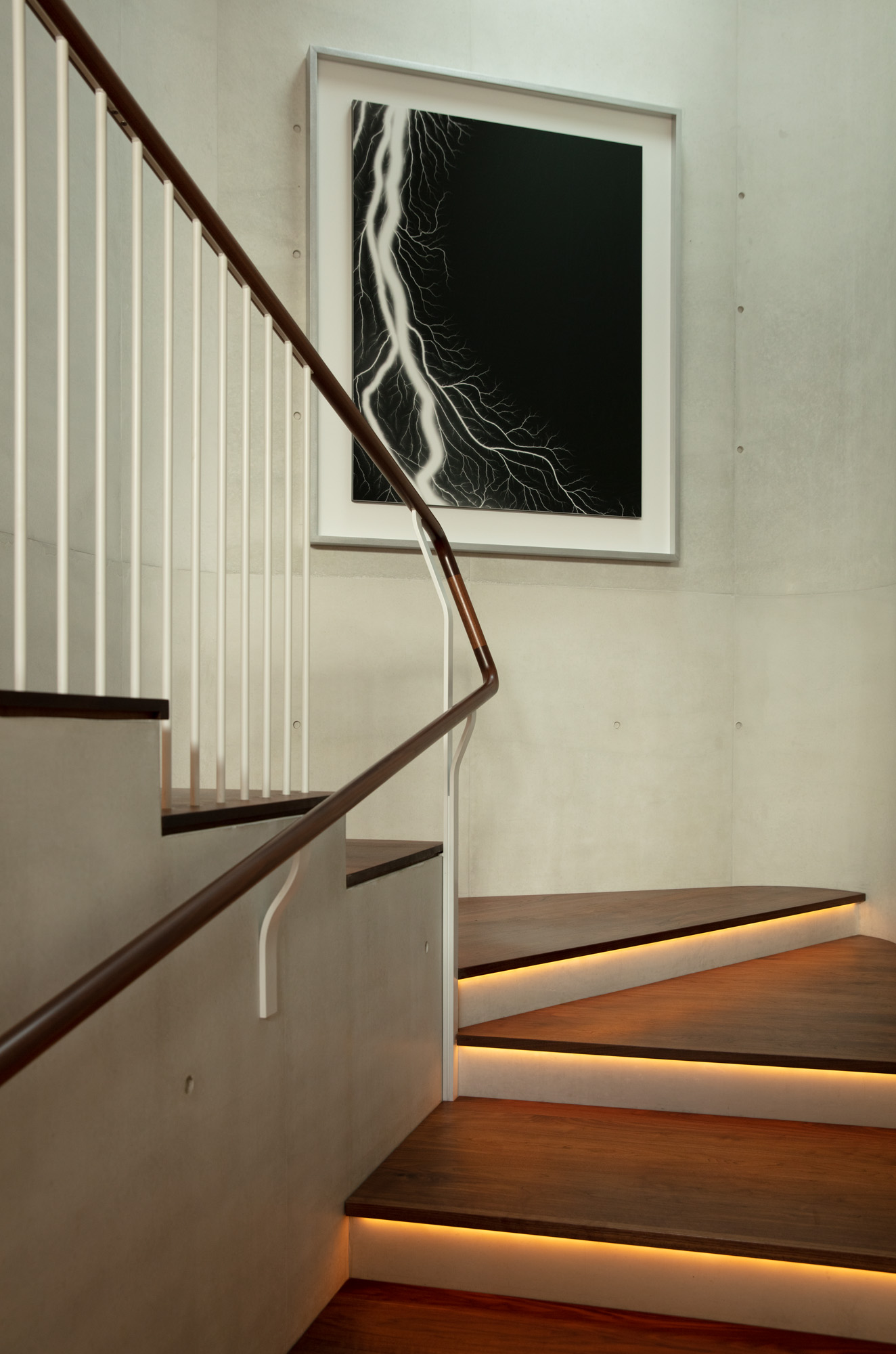 The house isn’t just about the big moments, of course; over the four years it took to create the residence, every low-key detail was considered and revised. There are silicon bronze nails with a handmade look in the cedar; brass strips that separate stone floors and carpets in the private areas of the house; door handles wrapped in leather supplied by a tannery up north so that the touch is pleasurable. The garage has a gorgeous cast concrete ceiling with recessed lighting, and a walnut floor, so it can be transformed into a party space. The architects even liaised with the neighbours to have every third tree removed from their boundary, to create more light and an artful aesthetic.