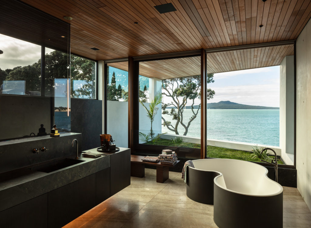 The upstairs master suite is a masterclass in Cotter’s layers of restrained luxury and smokey masculine tones. Textured linen Gesso Cocoa wallpaper and inky carpet cocoon the room, which is then adorned with tactile draperies and Turkish bed linens. In the master bathroom, Rangitoto Island in all its glory can be seen from the quirky Matisse bath, the double shower, and the steam room. The sound of waves hitting the shore is amplified throughout the space, which is lined in opulent stone, chosen to pick up on the tones of the basalt on the shoreline below.
