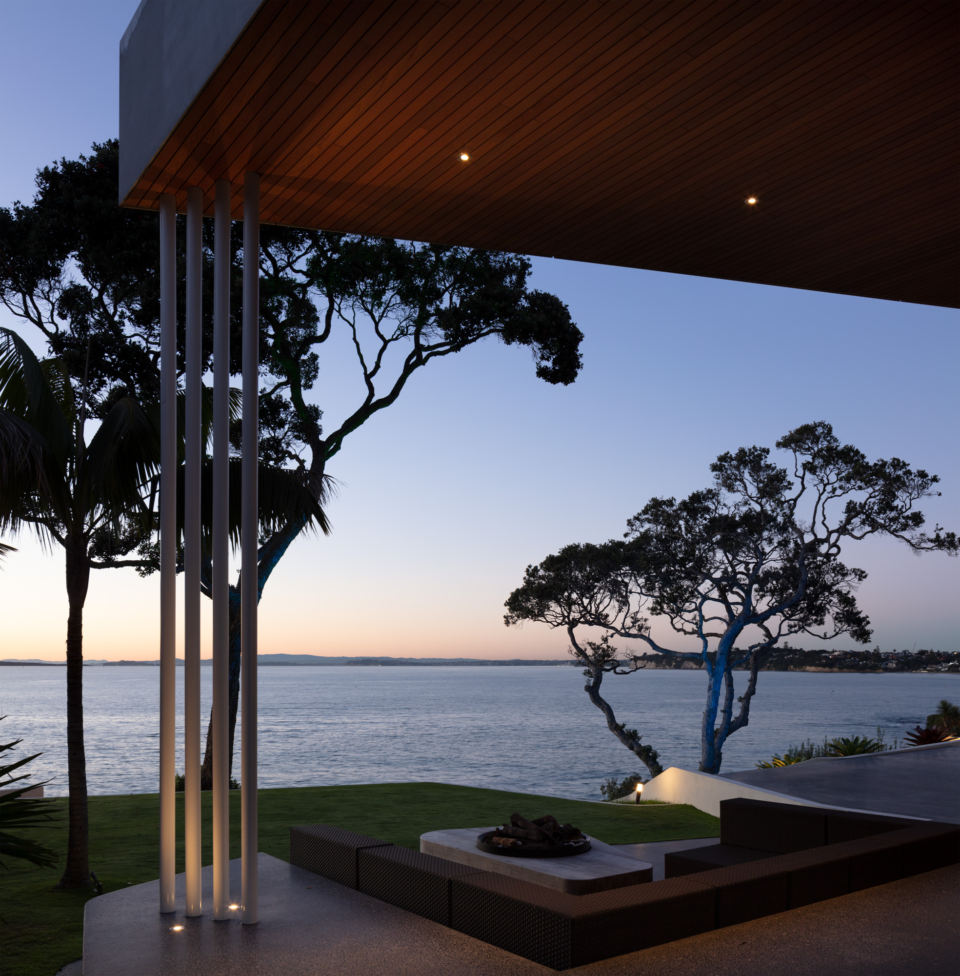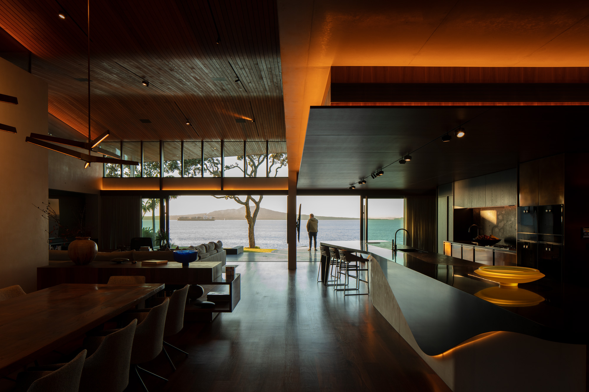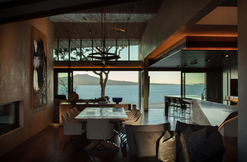 A gallery both for living and for housing an amazing art and object collection. A well-chosen material palette that uses texture and pattern to complement the highly crafted and robust construction materials. From overseeing an impressive number of custom-made furniture and soft furnishing pieces — from both New Zealand and as far away as the Netherlands — through to selecting pieces that enhance the impressive collection here, the designer has created an interior that is acutely sensitive to the architecture, the art, and the impressive natural context it sits within.