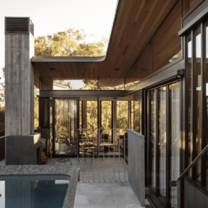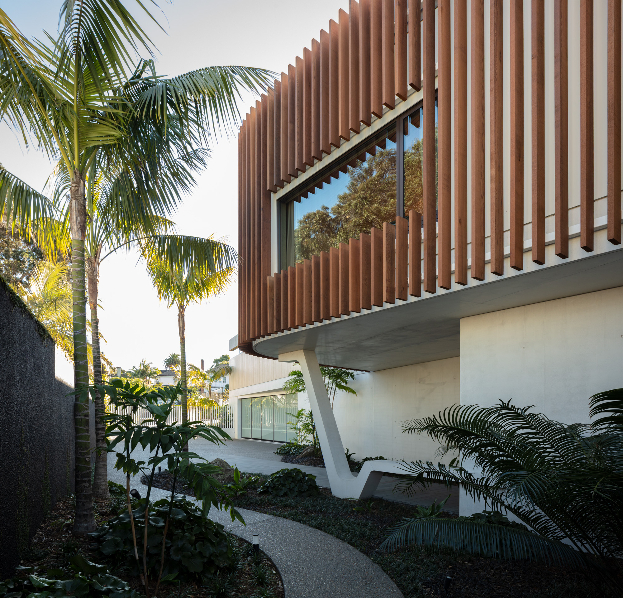 Timber fins and exterior panelling lend a decorative element and provide privacy from the surrounding neighbours, as do the marble fins on the exterior of the guest quarters. Inside, walnut floors and rolling cedar ceilings are an organic counterpoint to the interior concrete walls, which are sculptural in form and beautifully unfinished with a regular indent of delicate plug holes from the construction process.