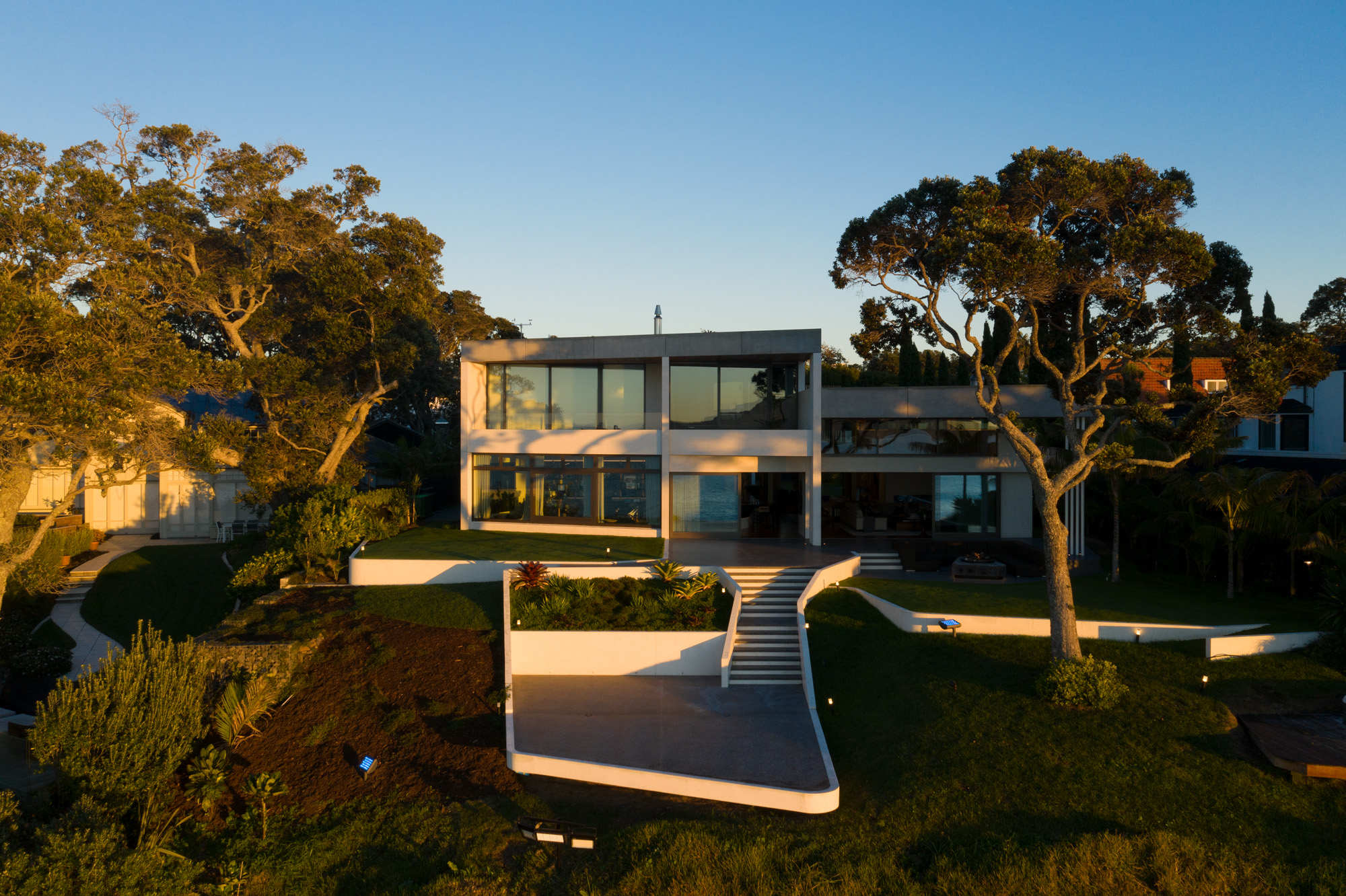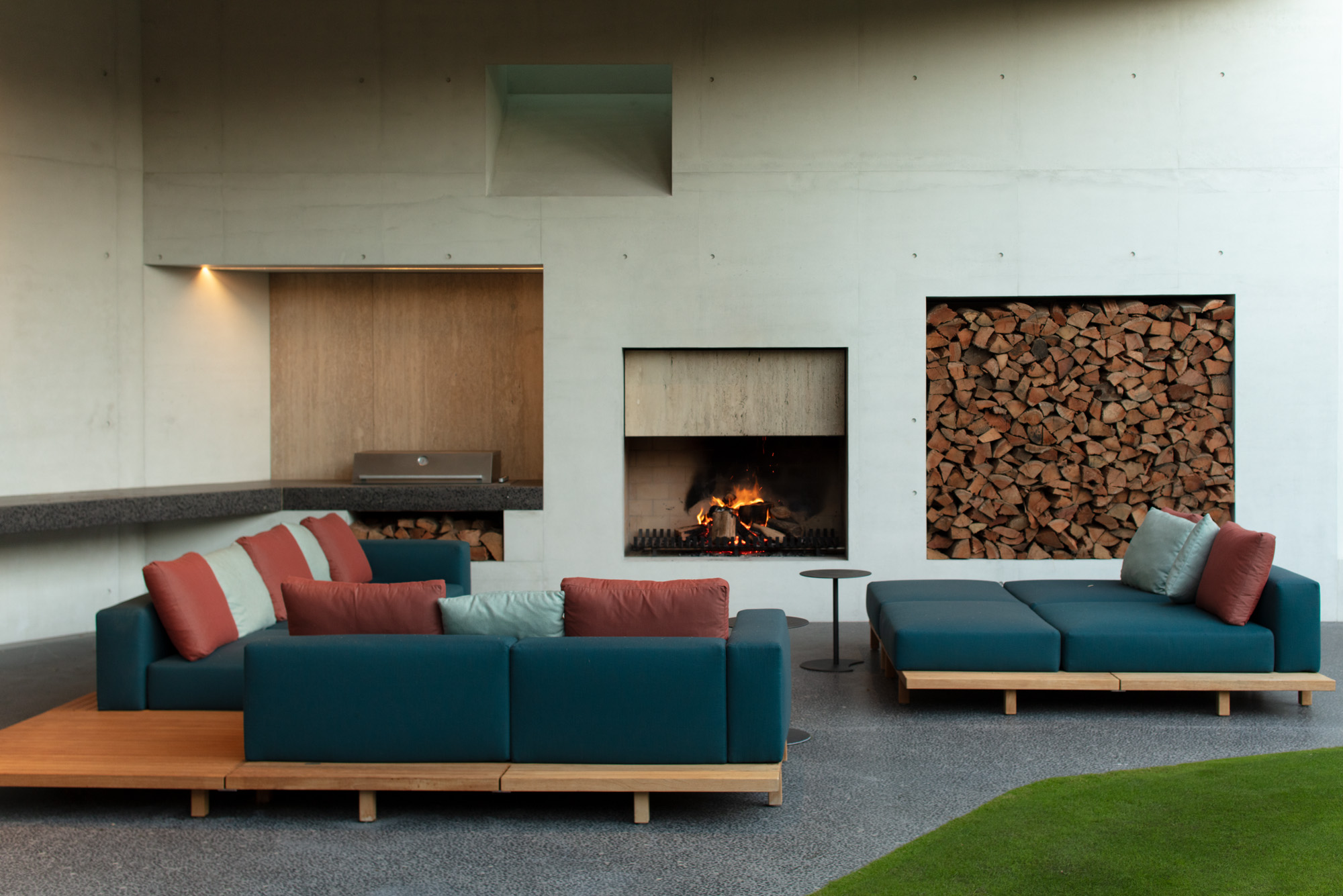 Off-white and grey concrete was chosen for exterior and interior walls. Cream marble and rich timbers complete the trio of architectural surfaces.