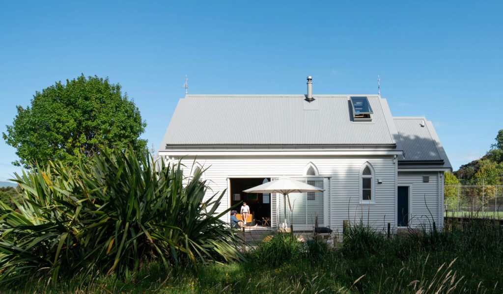 The historic Wainui Church is thoughtfully reimagined as a compact dwelling, its adaptive reuse grounded in the Canterbury landscape. Image: Ian Hutchinson