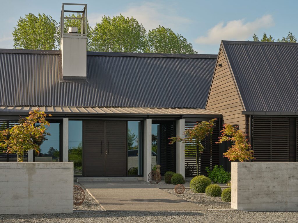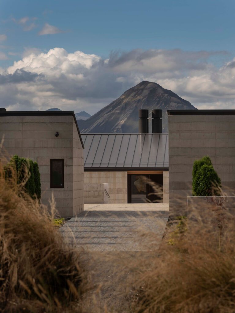 The Hepburn’s Road House embodies that anticipation. Set on a rural mid-Canterbury site with views to Mt Somers and the Southern Alps, the home nods to the region’s working landforms, weather patterns and building traditions, translating them into a language of symmetry and proportion. The home reveals itself gradually through a series of gabled pavilions, each with a distinct material identity: concrete for principal rooms, timber for secondary spaces, corrugated steel for outbuildings. Volumes are precisely placed to delay the complete panorama, drawing visitors through a progression of thresholds before the landscape fully unfolds.