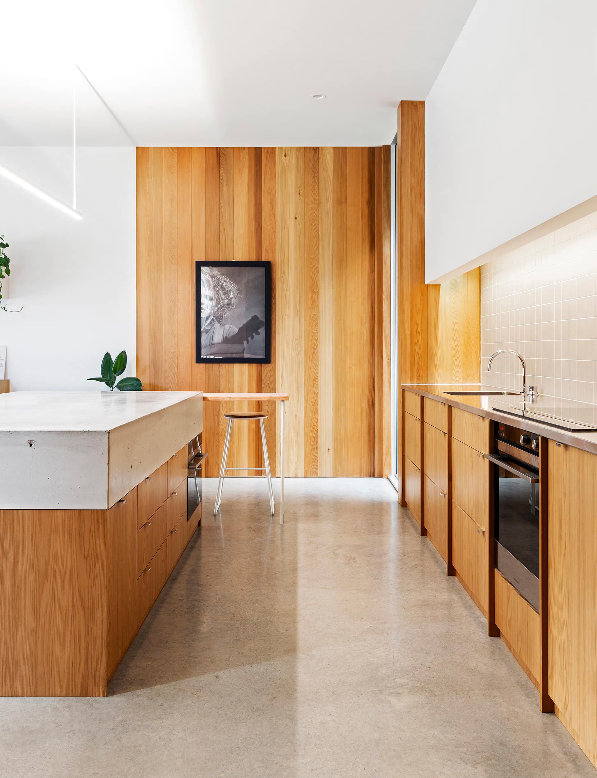 To manage costs on this comprehensive build, and to also lend a personal touch to his family home, Ben donned his tool belt and got to work, sending the builders home six months ahead of completion. He built all the cabinetry – an impressive custom cedar kitchen, bathroom vanities, timber panelling and the cedar-shingle utility building. It was an all-consuming project, not all of it enjoyable but, ultimately, satisfying. “When you’re trying to do a house that’s very pared back and minimal, it isn’t easy,” says Ben. “It’s about the whole process.”
