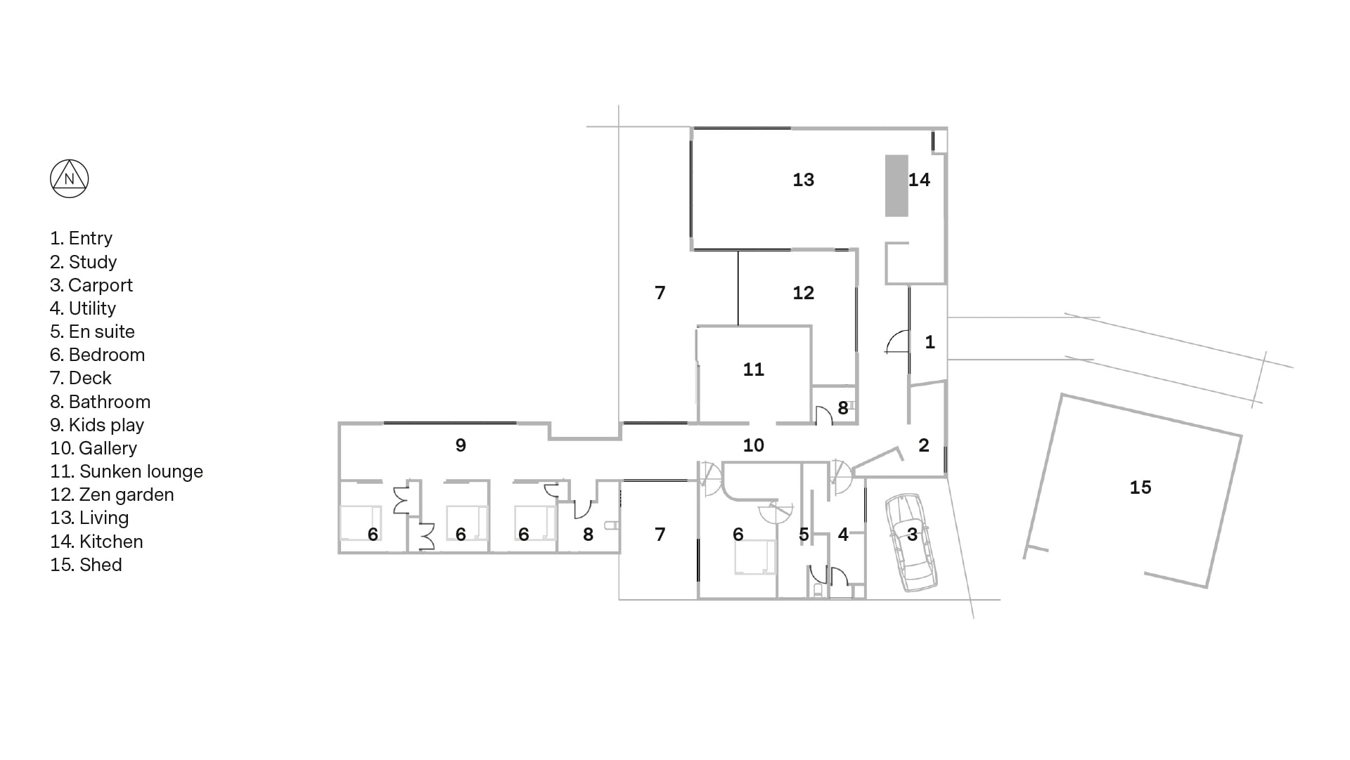 The internal garden and a sunken lounge are revealed on entry. At right is the kitchen and dining area, while at left are four bedrooms, the bathrooms and the deck off the main suite. There are acres of space for the kids to roam around in. Games of hide-and-seek could be an endless pursuit.