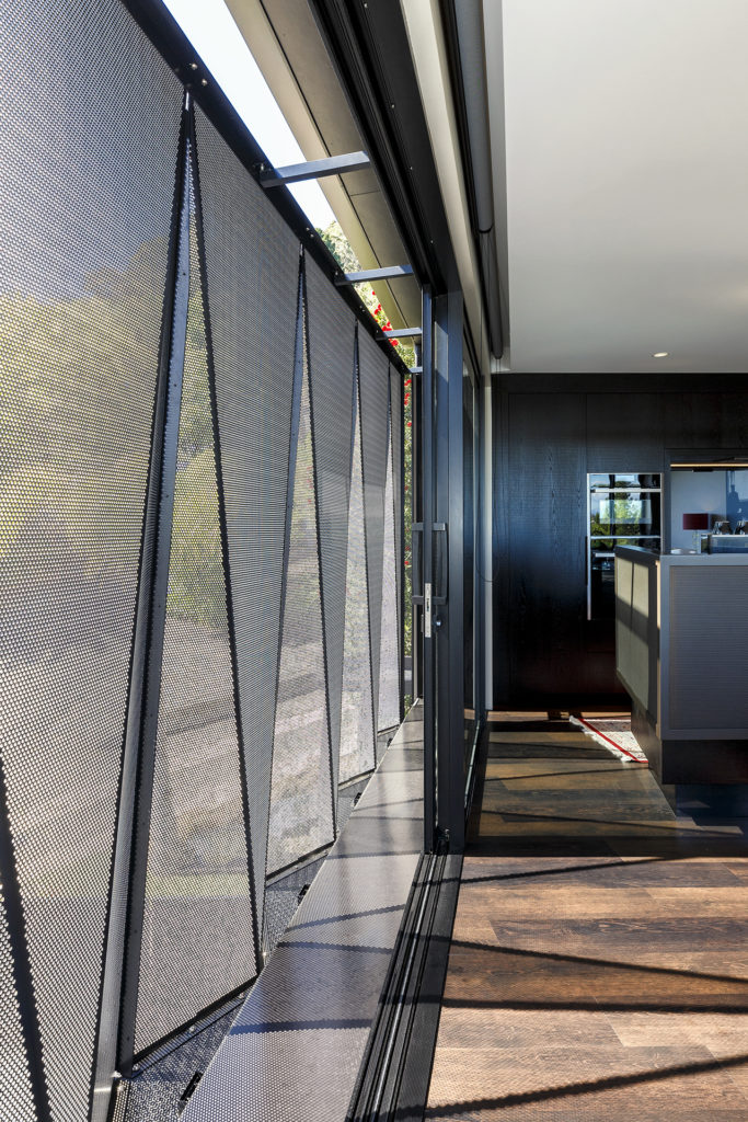 Angles strike the visitor everywhere, beginning at the front gate. To start with, the steep incline of the street seems to emphasise the angle of the monopitch roof. Yet it is the diamond-pattern aluminium screen dominating the front of this abode that proudly states the design’s angularity.