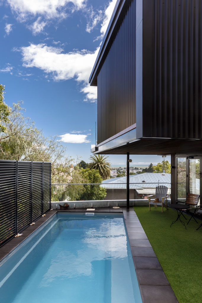 Yet, while the outlook of the house was at 90 degrees to the street frontage, Simon wasn’t willing to surrender the facade to a blank, impenetrable wall. He opted instead for a screen, which, although not cheap, racked up an impressive tally of wins. It adds privacy while still allowing views and a connection to the street; it provides protection and security when the sliding windows are fully opened; it provides shade and adds genuine drama among the more conventional properties on the street.