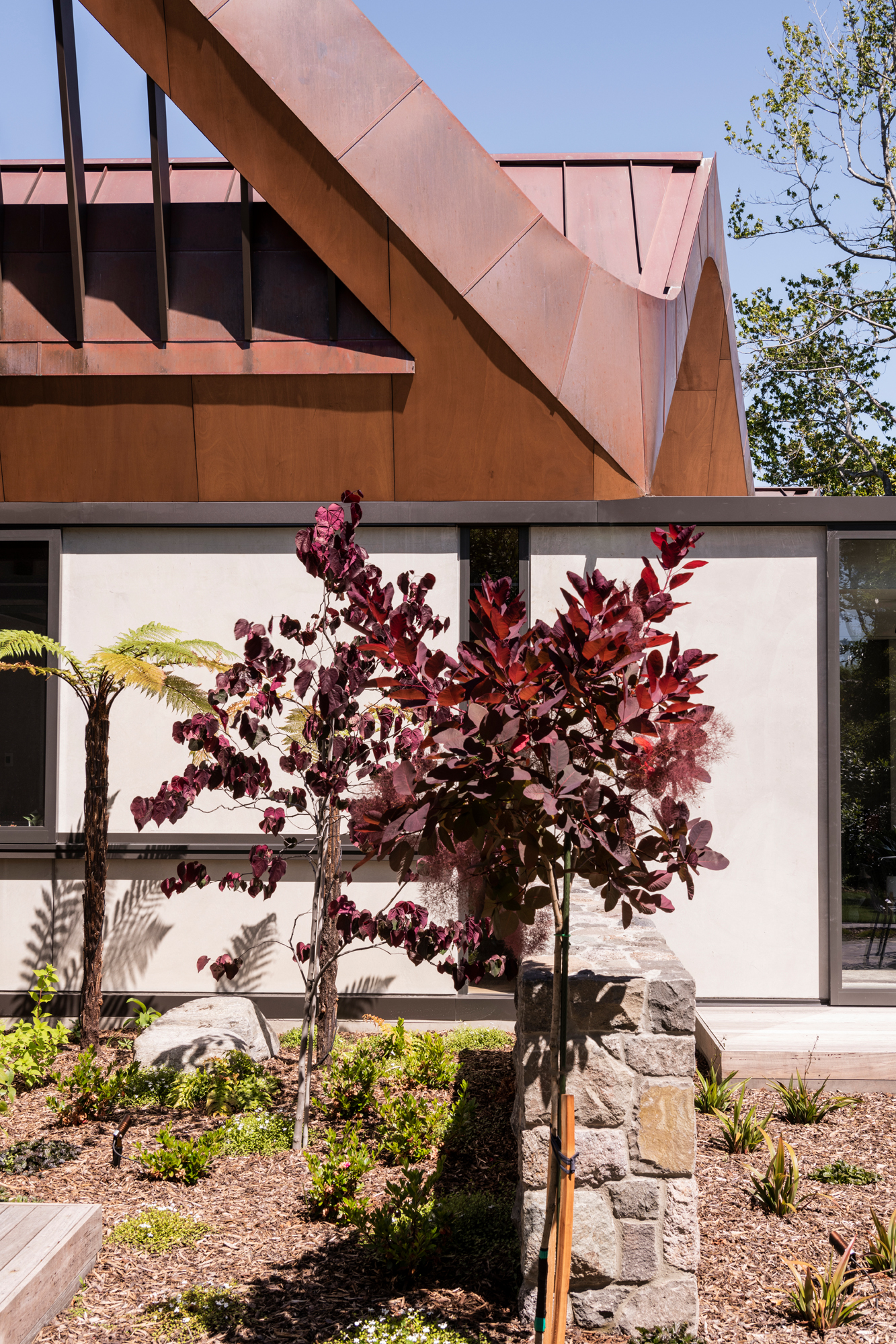 DK: Yes and no. The native stream-side plantings have been retained and enhanced with the aim of attracting birds. Some existing large NZ beech, kowhai, pittosporum, and Dicksonia are attracting birds and insects. The relocated trees will provide nesting spaces for birds and insects.