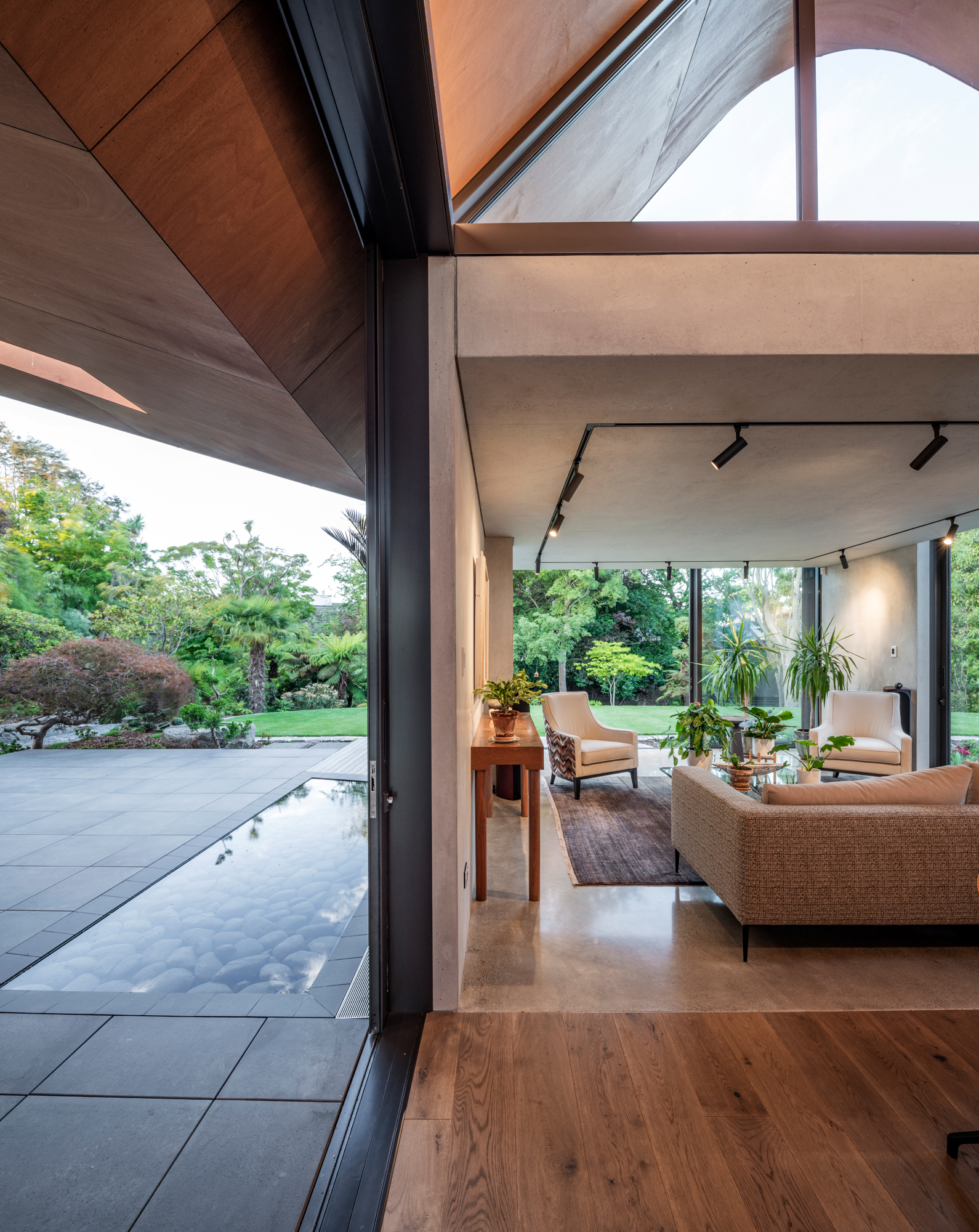 DK: It is, isn’t it! We have worked on a number of projects with Craig and the team at South Architects and it’s always interesting to see which shapes, forms, and functions arise. The house is big. We wanted to help nestle it into the garden, the stream, the landscape. Existing and relocated trees and shrubs helped this. The organic, flowing form of the architecture certainly helped guide the backyard. We didn’t want any straight lines on this side to complement the house form.